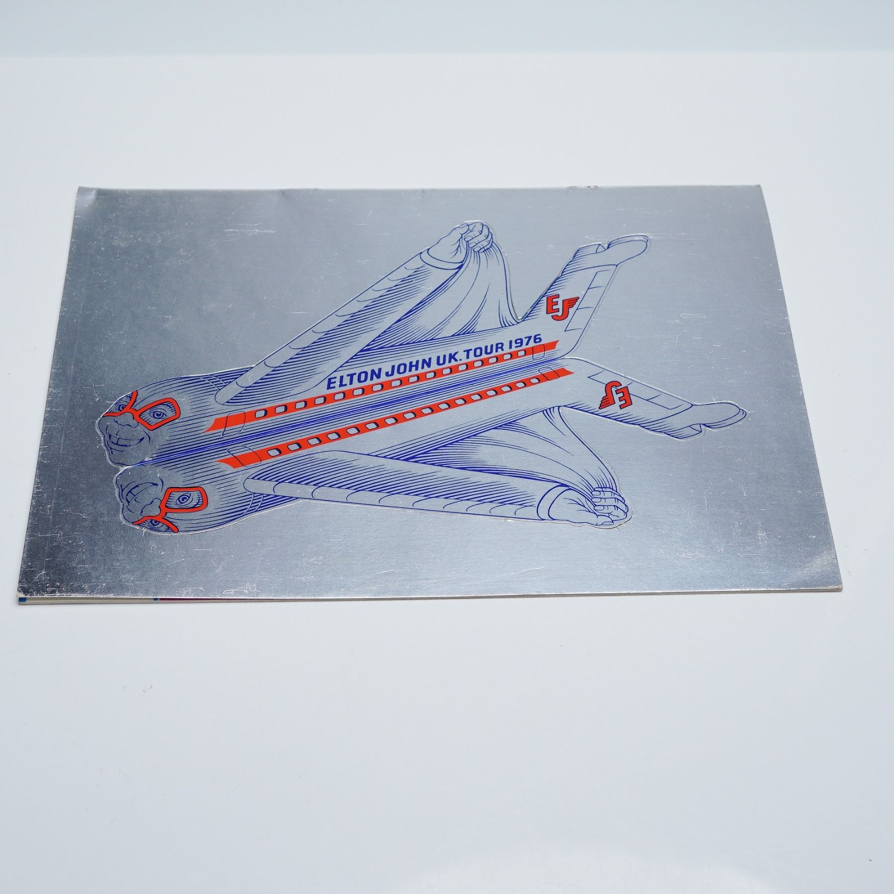 This vintage program from Elton John's 1976 U.K. Tour features the Louder Than Concorde (But Not Quite As Pretty!) show. It includes images of the artist, concert dates, and creative designs centered around the tour theme. The cover features an iconic graphic of a Concorde jet with piano keys. Measures 8.25"L x 11.75"H.