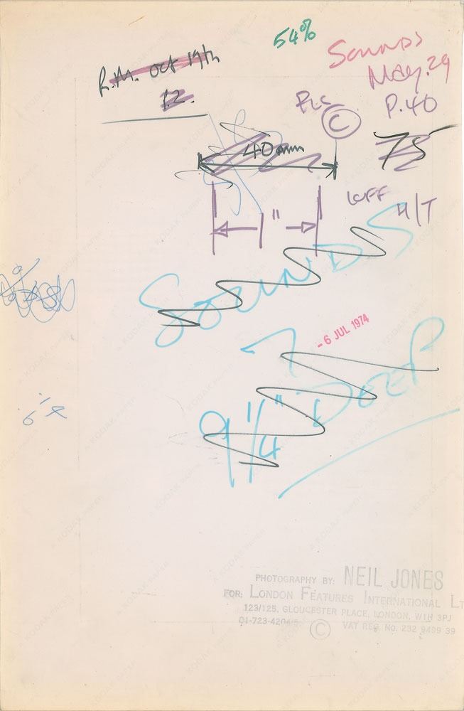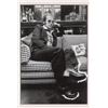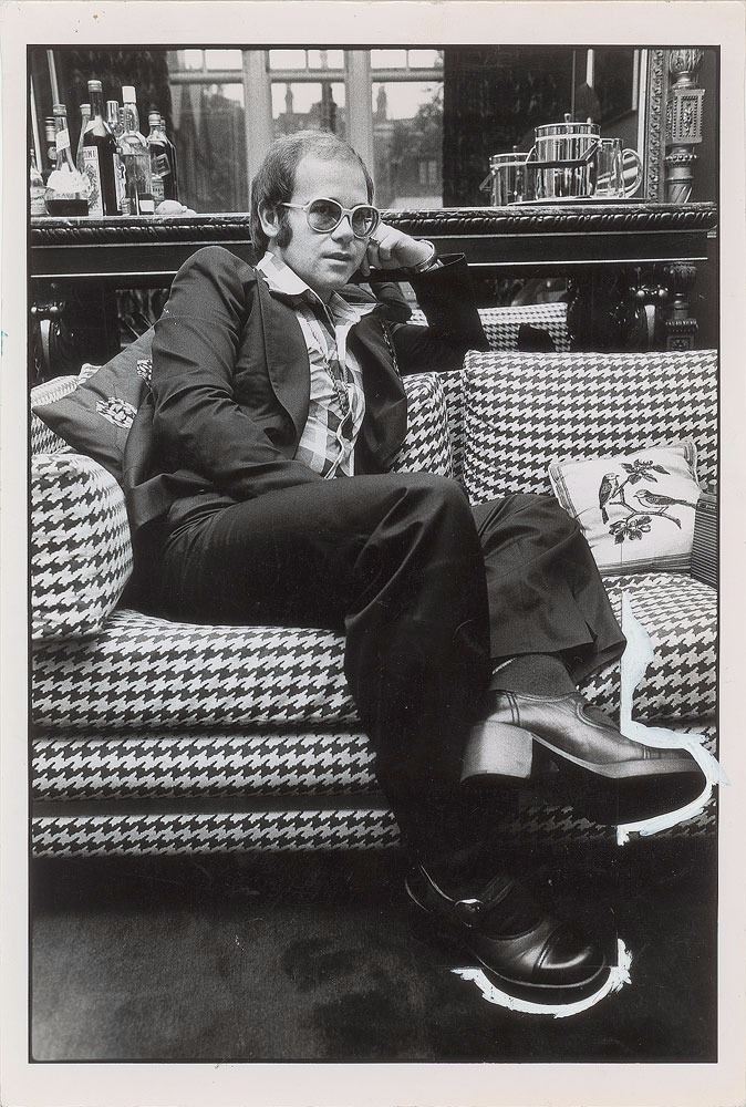 Original vintage glossy 8 x 12 silver gelatin photo of John relaxing on a busily patterned sofa in front of a luxurious bar and city skyline. Reverse is date-stamped July 6, 1974, and bears a Neil Jones photographer’s stamp. In fine condition, with scattered creasing, trimmed edges, and editorial paint to lower right.