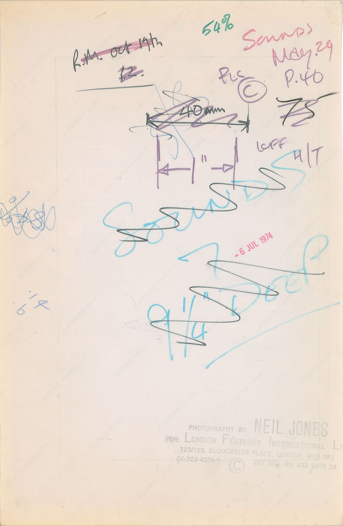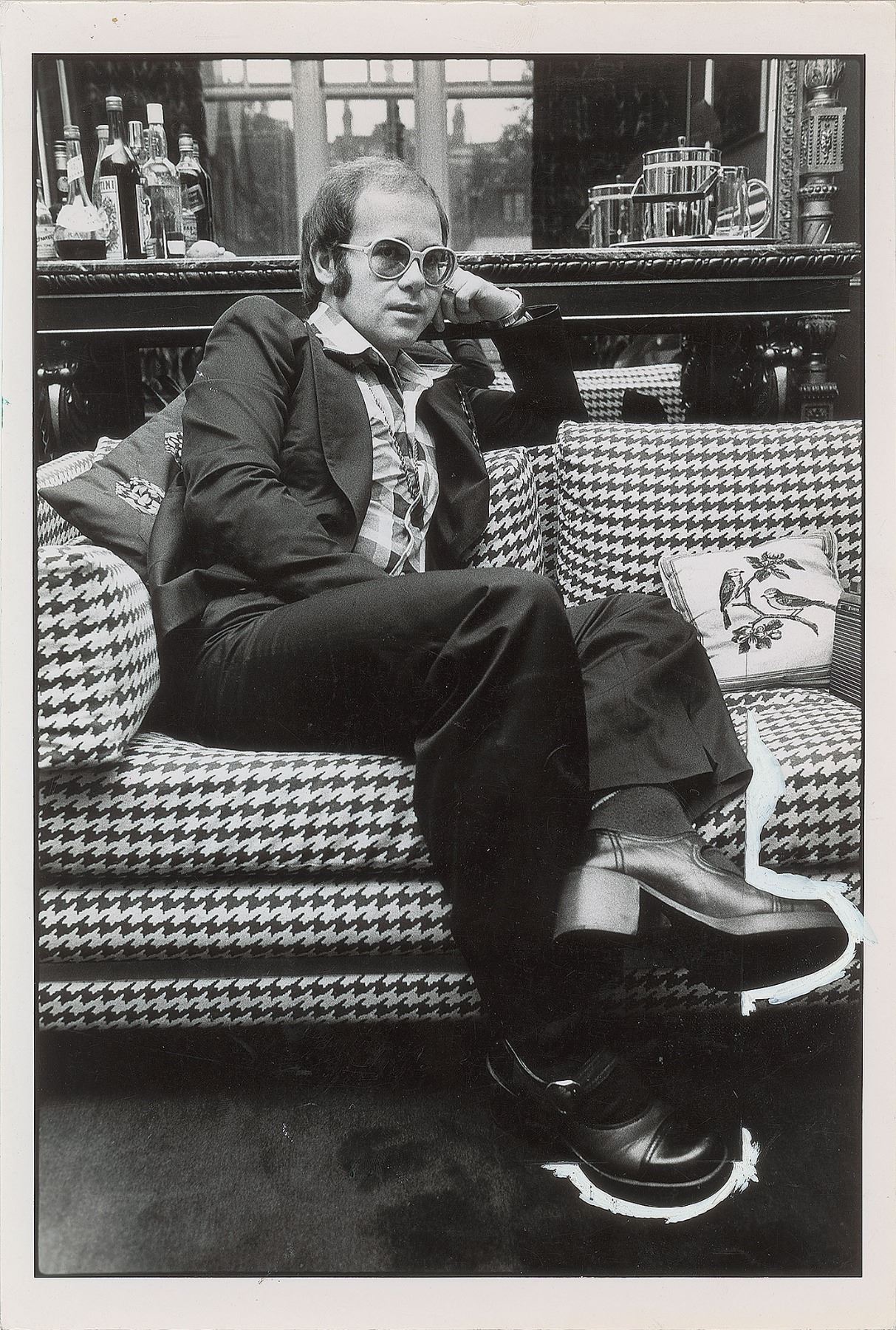 Original vintage glossy 8 x 12 silver gelatin photo of John relaxing on a busily patterned sofa in front of a luxurious bar and city skyline. Reverse is date-stamped July 6, 1974, and bears a Neil Jones photographer’s stamp. In fine condition, with scattered creasing, trimmed edges, and editorial paint to lower right. From the Globe Photo archives.