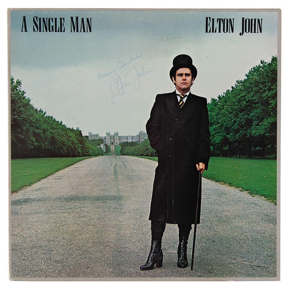 A Single Man album by Elton John, who has signed the front cover in blue ballpoint, "Merry Christmas, Elton John." In fine condition. The record is not included.