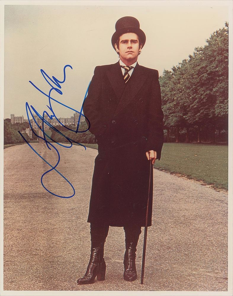 Color glossy 11 x 14 full-length photo of Elton John as he's depicted on the cover of his 1978 album A Single Man, signed in blue felt tip. In fine condition. Originally obtained by in-person specialist Mike Wehrmann.
