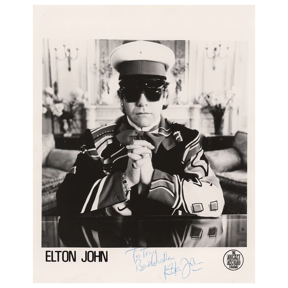 Glossy 8 x 10 The Rocket Record Company publicity photo of John seated with clasped hands and wearing a stylish uniform with cap, signed and inscribed in the lower border in blue ballpoint, "To Tony, Best wishes, Elton John.†In fine condition.