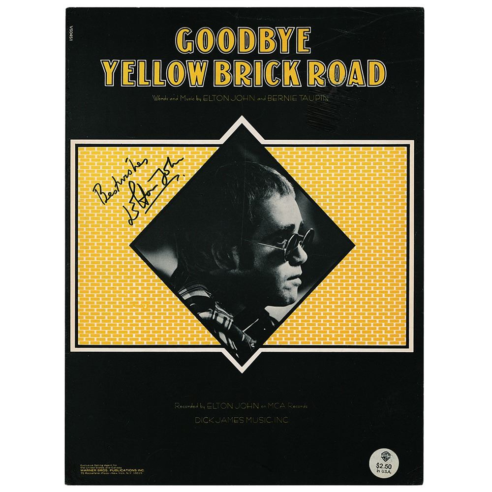 Sheet music booklet for the Elton John song 'Goodbye Yellow Brick Road,' 9 x 12, signed on the front cover in black felt tip, "Best wishes, Elton John." The inner pages and back page bear ink notations by an unknown hand. In very good to fine condition, with creasing, handling wear, and an area of surface scratching. Accompanied by letters of authenticity from REAL and Rockaway Records.