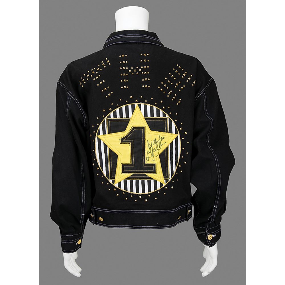 Fantastic black denim ‘Versus’ jacket made by Gianni Versace for Elton John’s The One World Tour of 1992 and 1993, size XL, featuring gold-tone lion buttons to front closure, pockets, waist and cuffs, and back featuring gold-tone studs that read “THE” above a large fabric design with overlapping embroidered circle, square, and star patterns with a central “1” numeral, signed prominently within the yellow star in black felt tip, “With love, Elton John, x.” The Versace tag to collar retains its original Versus booklet. In fine condition.