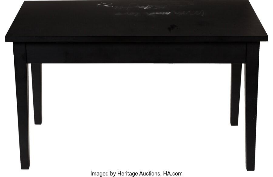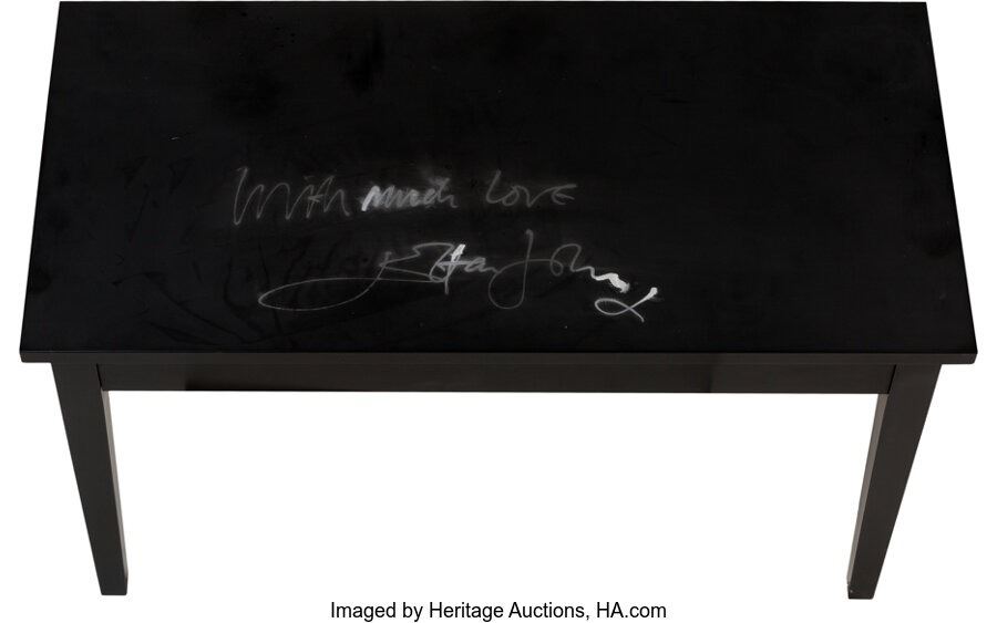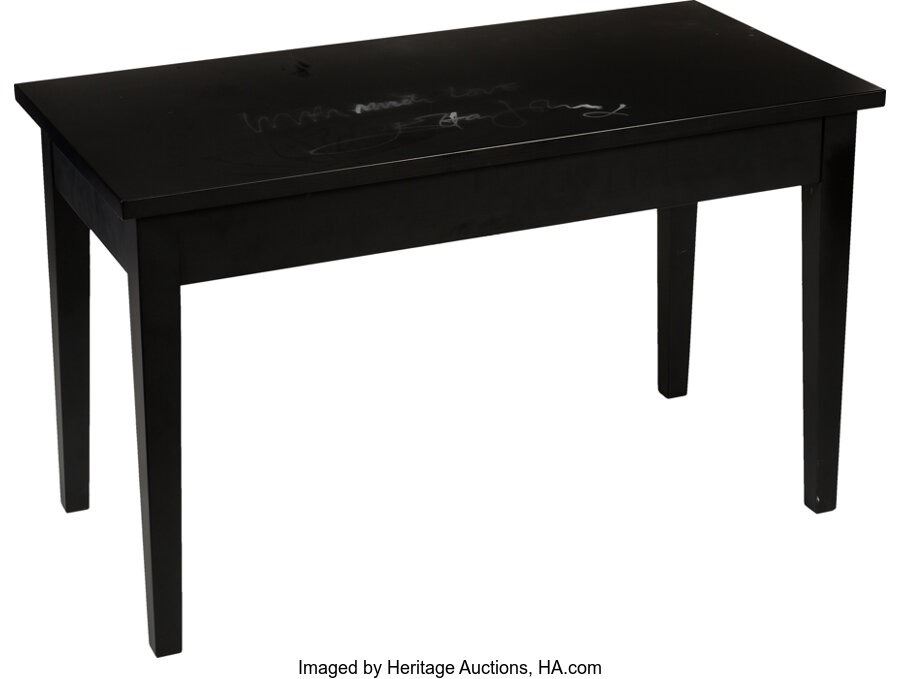 Elton John Signed and Inscribed Piano Bench. A black piano bench (measuring 15 ½" x 32" on top and 19" tall) signed (and inscribed "With much love") with a silver felt tip by Sir Reginald Dwight. The signature and inscription have significantly faded while the bench is in Near Mint Minus condition. Contains a cloth cover. COA from Heritage Auctions.