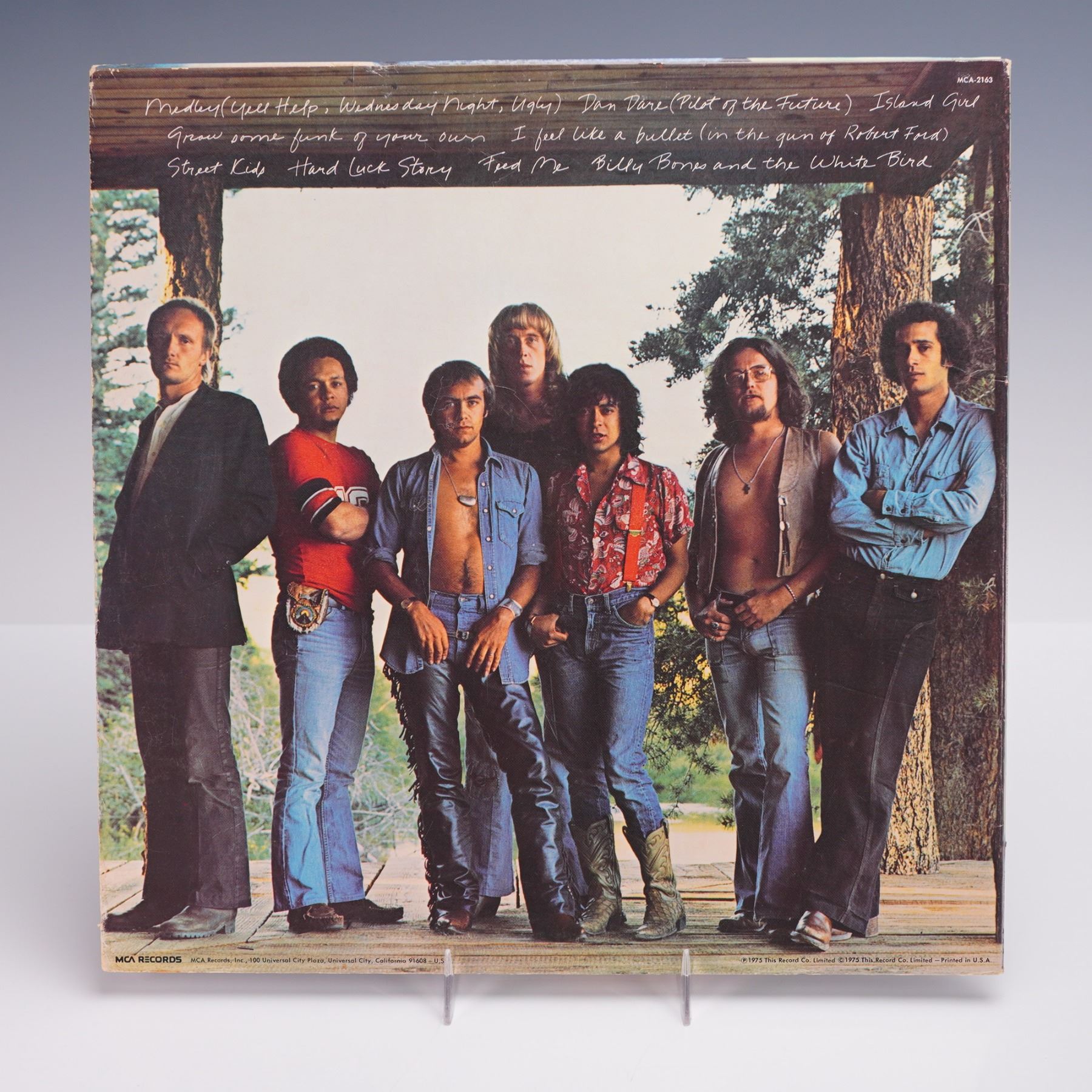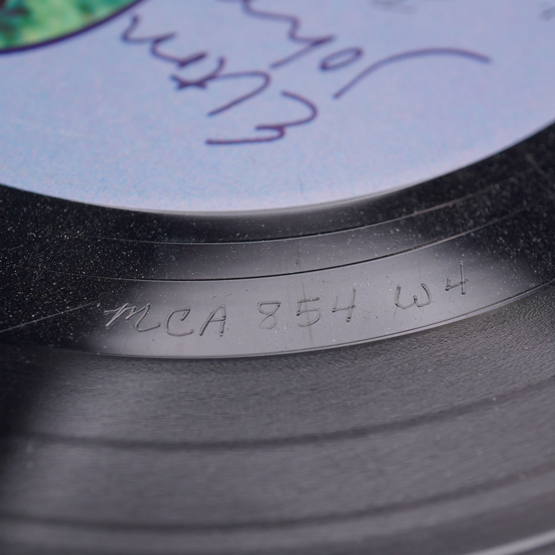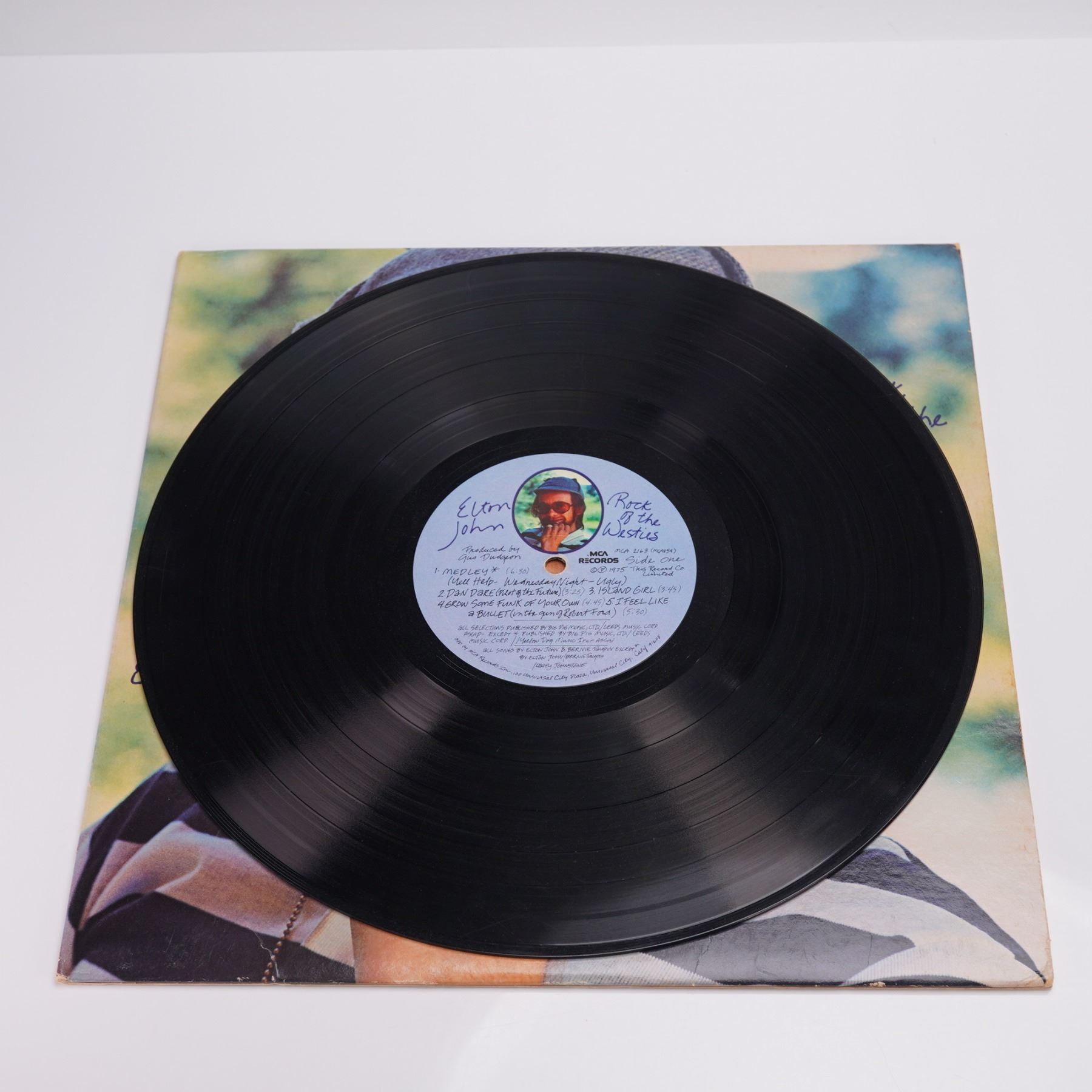 A 1975 U.S. pressing of Elton John's "Rock of the Westies" LP vinyl album, released by MCA Records. This studio album features a distinctive front cover portrait of Elton John wearing oversized sunglasses and adorned with rings, while the reverse side showcases the full band lineup in a rustic outdoor setting. The record itself bears a custom center label with handwritten style typography and a close-up image of Elton. The album includes tracks such as "Medley (Yell Help, Wednesday Night, Ugly)," "Dan Dare (Pilot of the Future)," and "Island Girl,"