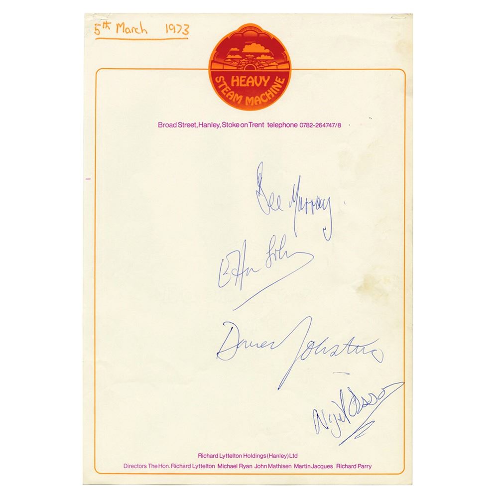 Circa 1973 ballpoint signatures of Elton John and his band—Davy Johnstone, Dee Murray, and Nigel Olsson—on an off-white sheet of Heavy Steam Machine stationery marked in the upper left, “5th March 1973,†the date that John and his group performed at the Heavy Steam Machine in Hanley, Stoke On Trent, England, and when these autographs were obtained. In fine condition, with a light stain to the right blank area. Accompanied by a certificate of authenticity from Tracks, and by a UK first vinyl pressing of John’s 1973 album Don’t Shoot Me I’m Only The Piano Player, which includes the record.