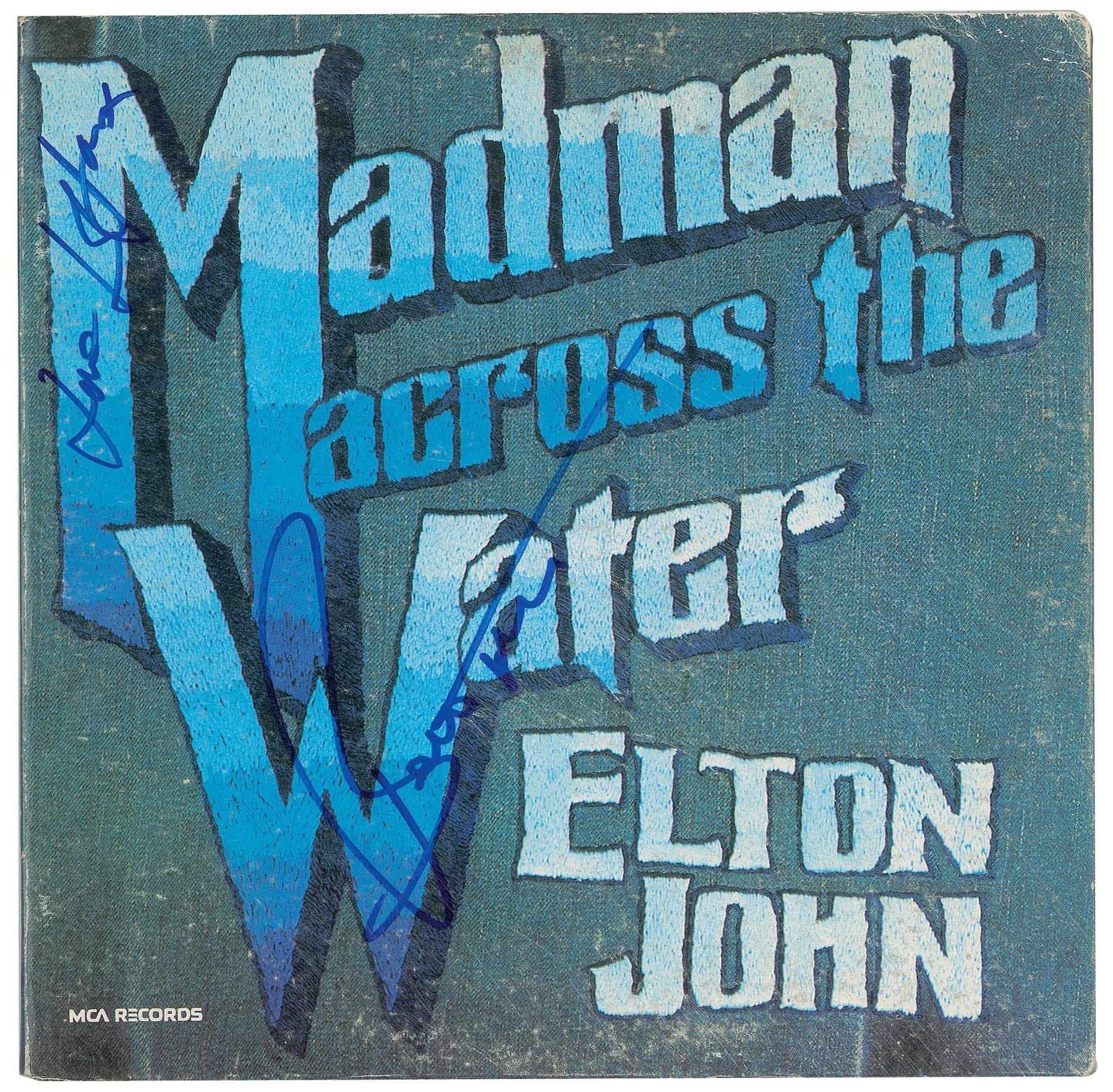 Madman Across the Water album by Elton John, signed on the front cover in blue felt tip, "Love, Elton, x" and "Bernie Taupin." In very good to fine condition, with light scuffing, and some dampstaining along the top edge. The record is included.