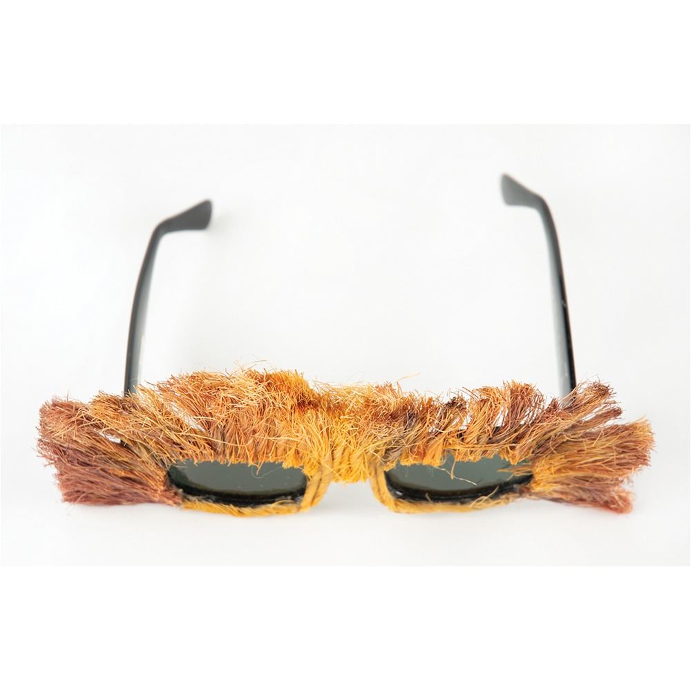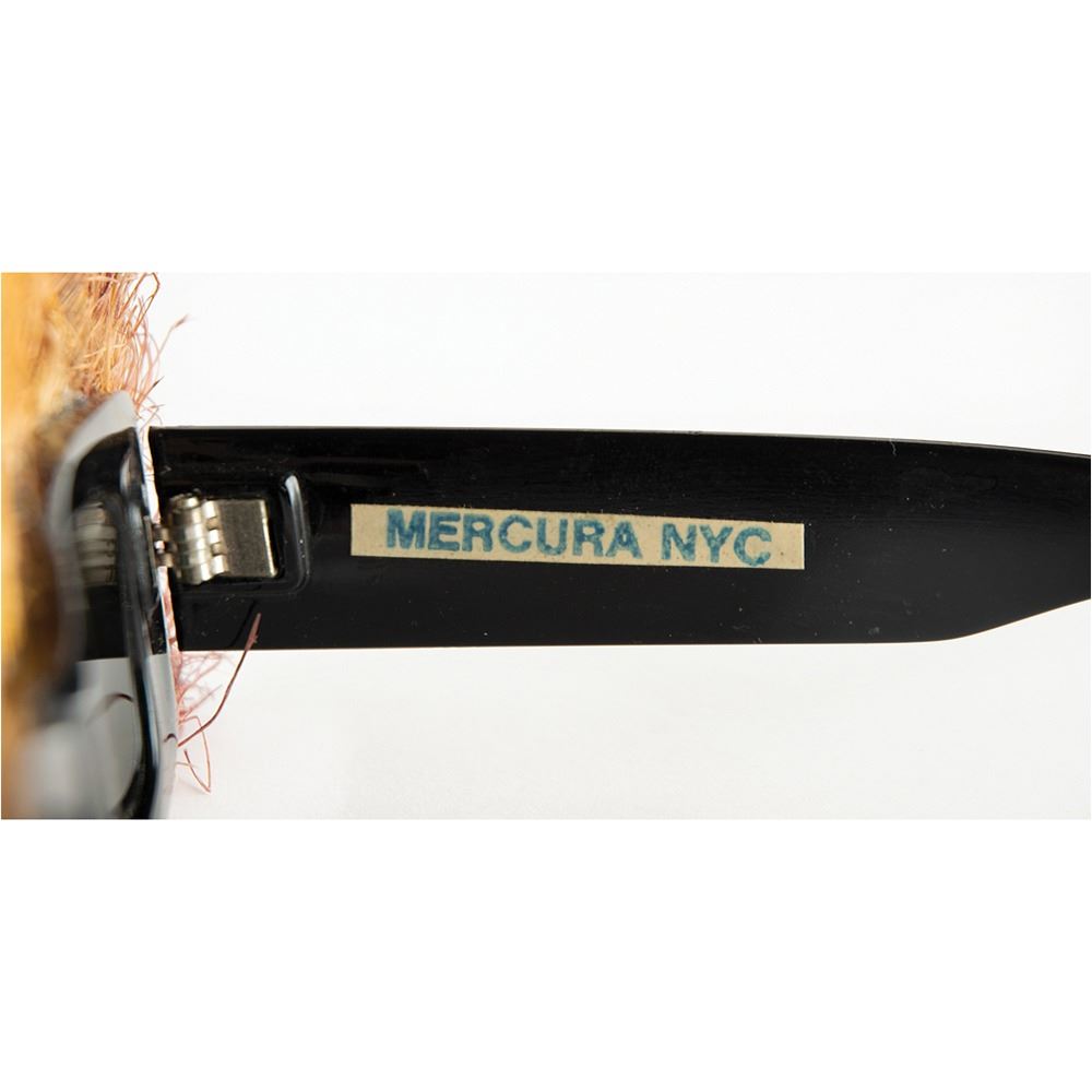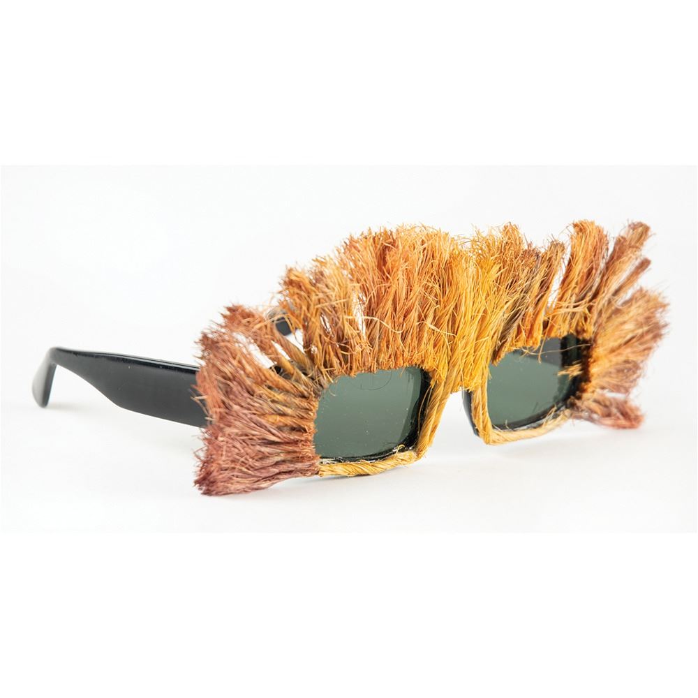 Elton John's personally-worn custom-made fringed sunglasses from a photo shoot for the 2011 spring/summer 'fruit and nut' issue of Pop magazine. The black sunglasses, by Mercura NYC, have been decorated with a stiff multi-hued tan fringe around the lenses. In fine condition. Accompanied by a certificate of authenticity from L.A. Archives, in part: "This letter serves to authenticate that this pair of sunglasses were worn by Elton John for his Fruit and Nut magazine photoshoot. These glasses were acquired directly from the designer." A fabulous piece from the legendary piano rocker, renowned for his flamboyant eyewear.