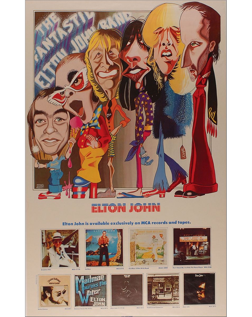 Original color MCA Records promotional poster for John and his band, 22 x 34.5, with a caricature of the band at the top and small images of the front covers of nine of his early albums. In fine condition, with scattered light creases and edge dings.