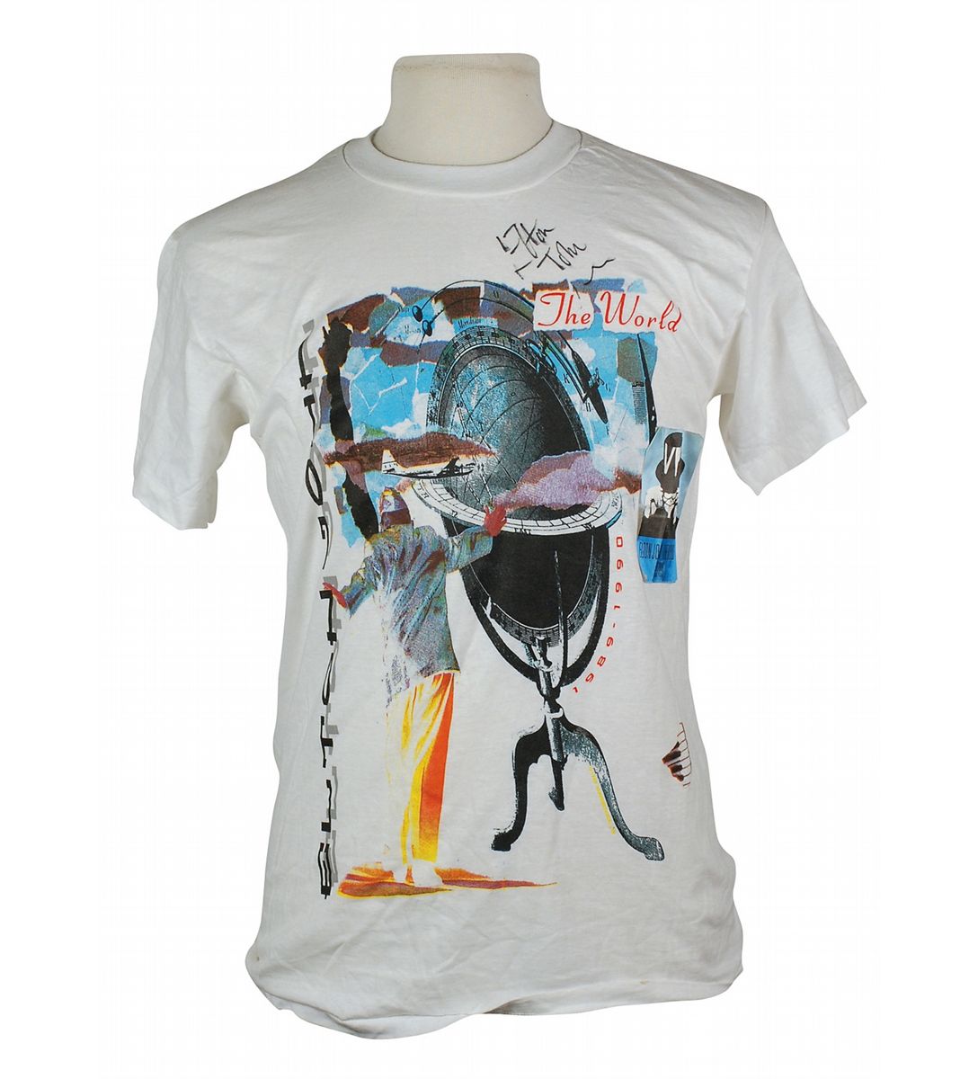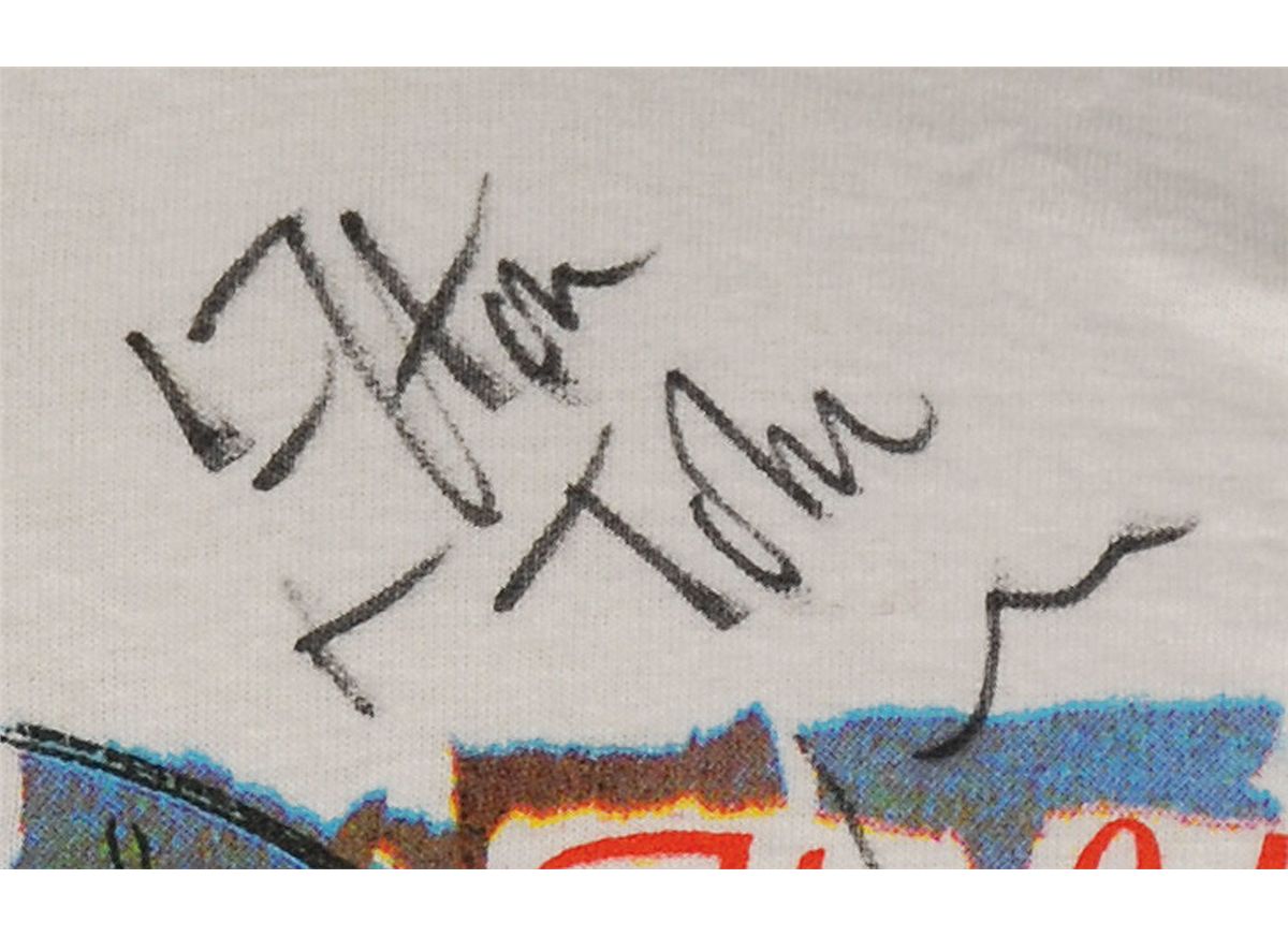 Concert t-shirt from John’s 1989–90 ‘The World’ tour, size medium, signed on the front in black felt tip. A VIP pass from the tour is also affixed to the shirt. In fine condition, with some creases to the affixed pass.