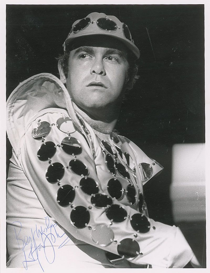 Glossy 6.5 x 8.5 photo of John in an elaborate costume playing the piano, signed in blue ballpoint, “Best wishes, Elton John.” In fine condition.