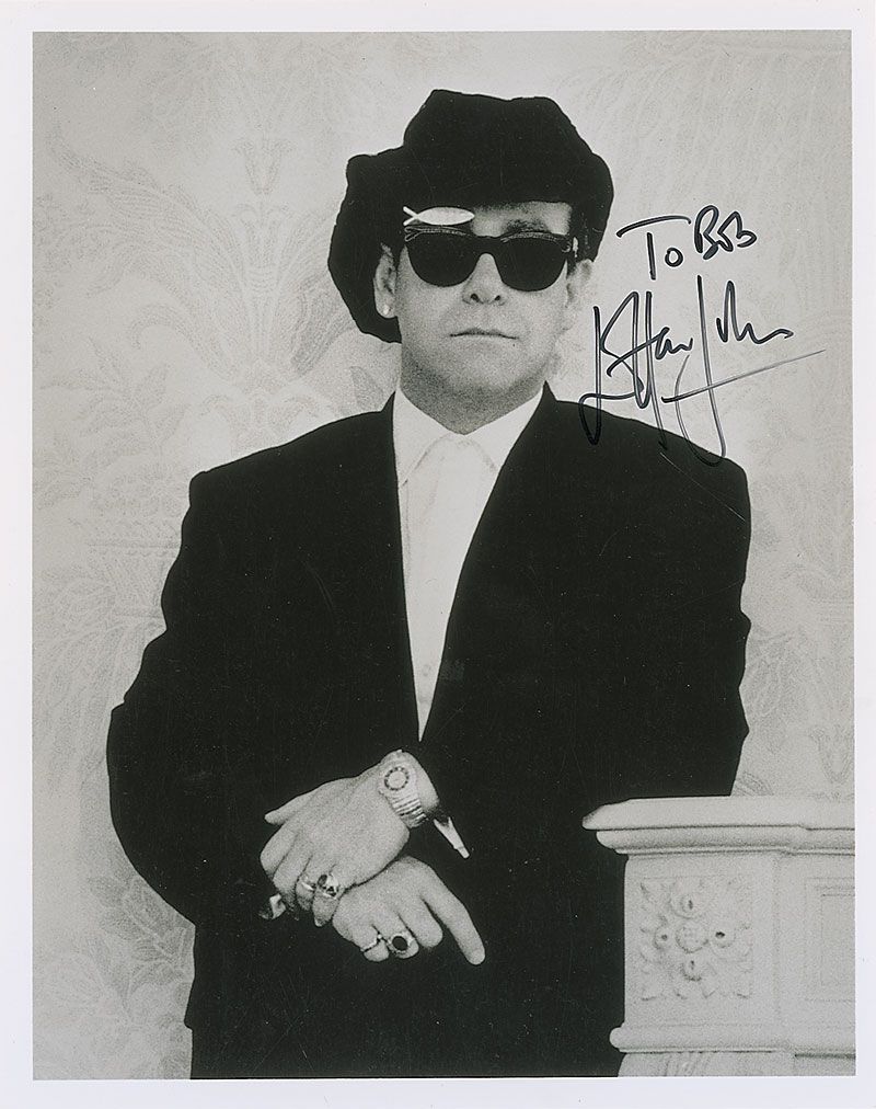 Glossy 8 x 10 photo of John in a dark suit and sunglasses, signed and inscribed in black felt tip “To Bob, Elton John.” In fine condition, with a couple small corner tip creases.