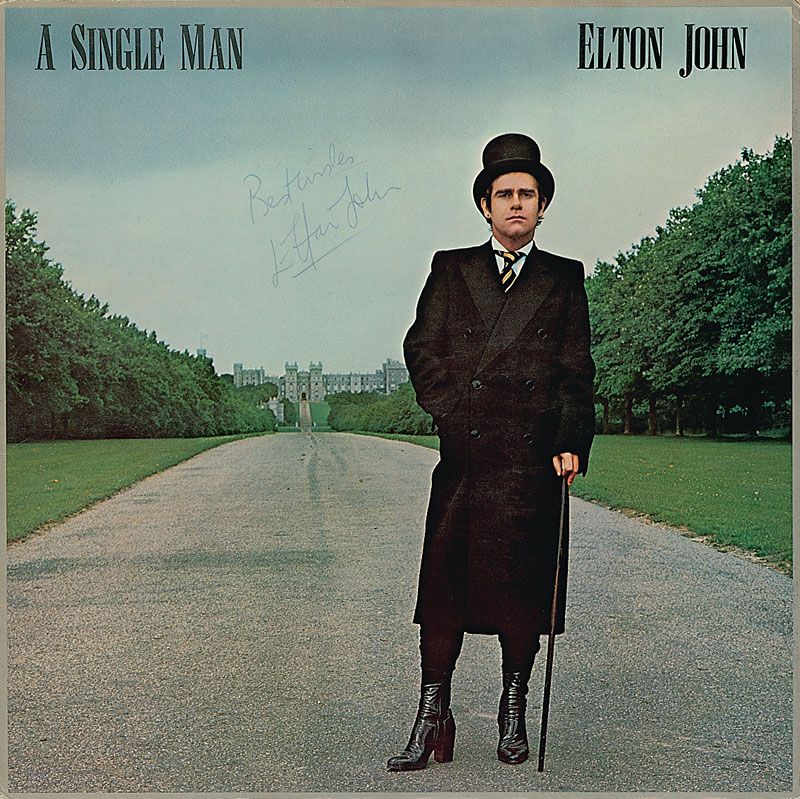A Single Man album signed on the front cover in blue ballpoint, “Best wishes, Elton John.” In fine condition, with a few light surface impressions to the cover. The record is included.
