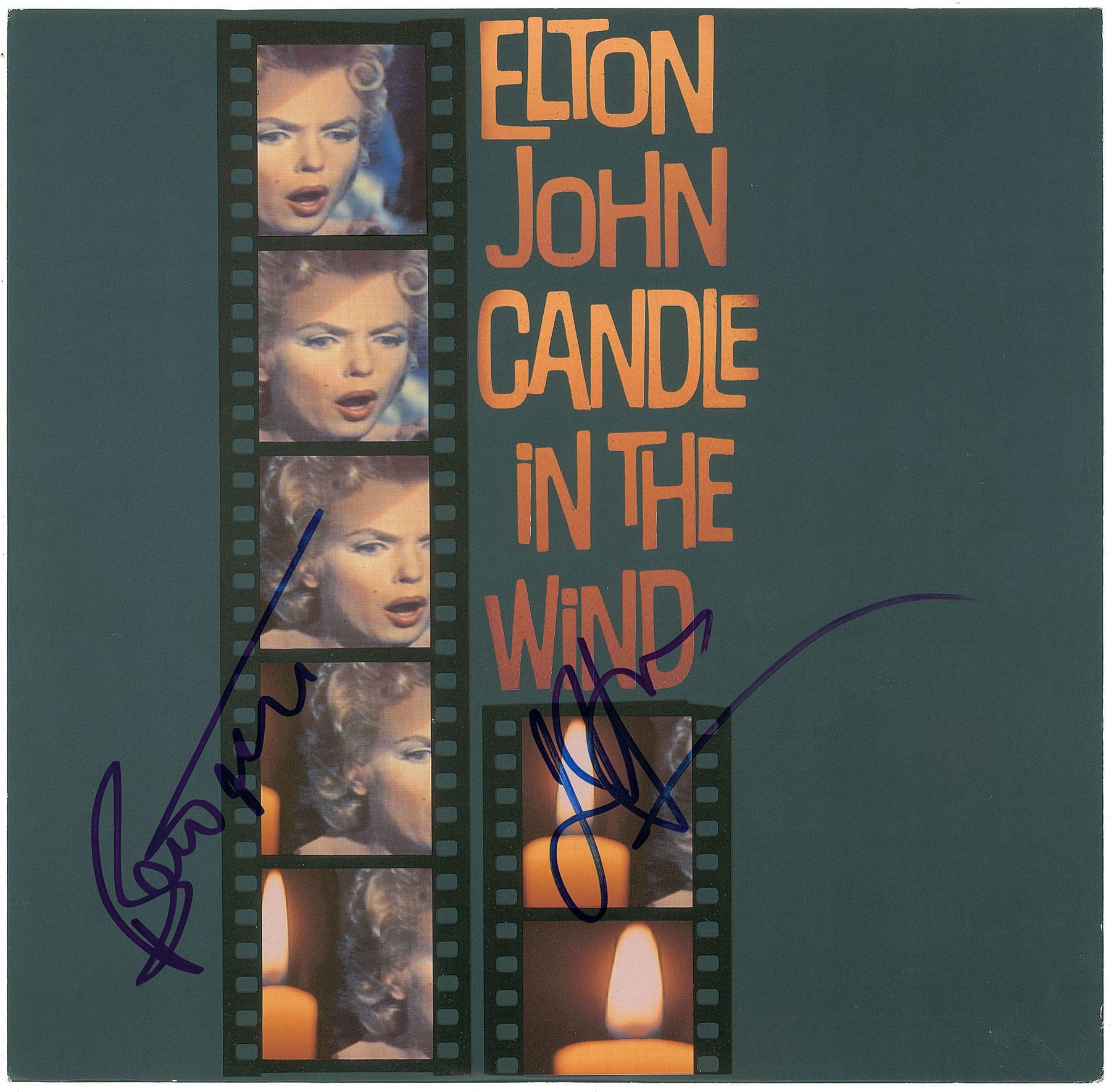 'Candle in the Wind' single album signed on the front cover in blue felt tip by Elton John and Bernie Taupin. In fine condition. The record is included.