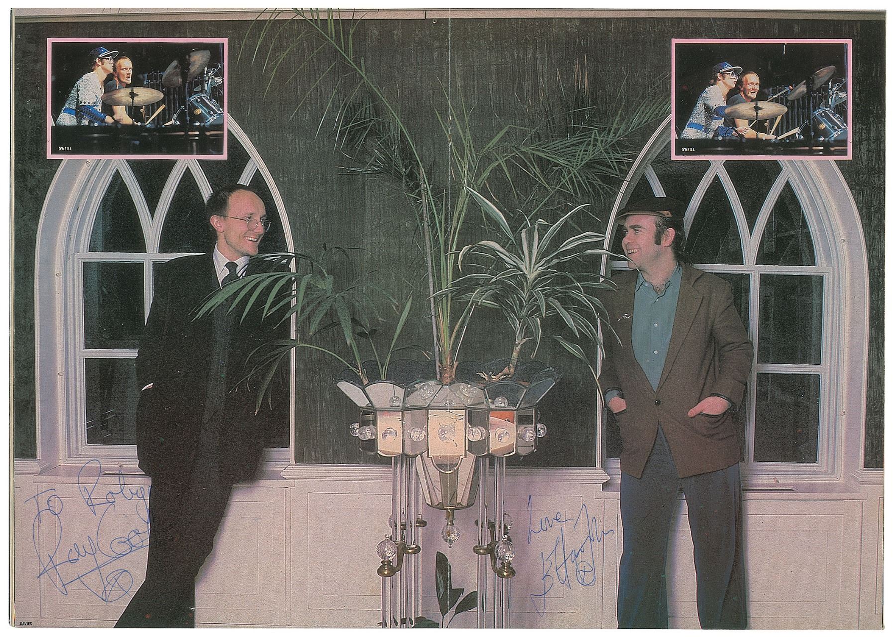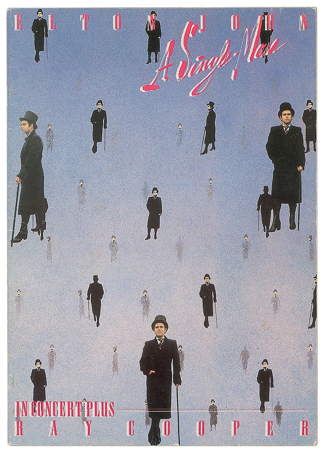 Program for Elton John's A Single Man tour with Ray Cooper, 8.25 x 11.75, signed and inscribed inside on the centerfold image in blue ballpoint, "Love, Elton John" and "To Robyn, Ray Cooper." In fine condition, with a ticket stub taped to the inside front cover, and a newspaper clipping taped to the inside back cover.