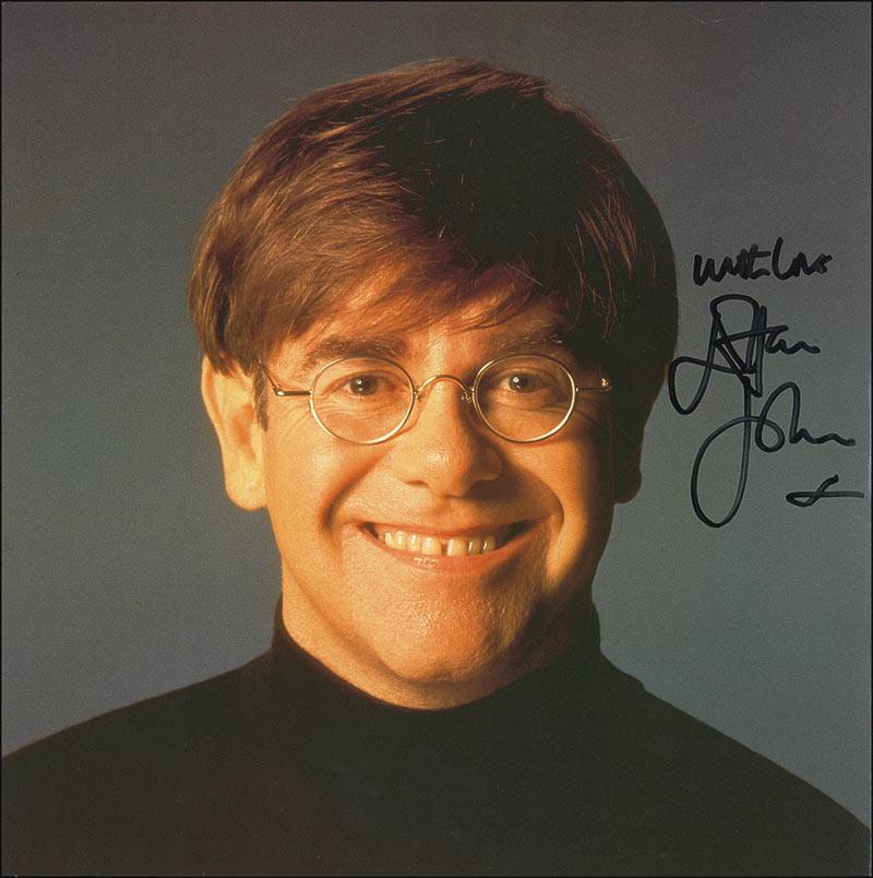 Inside album sleeve for Made In England, signed in black felt tip, “With love, Elton John.” In fine condition. The record is included.