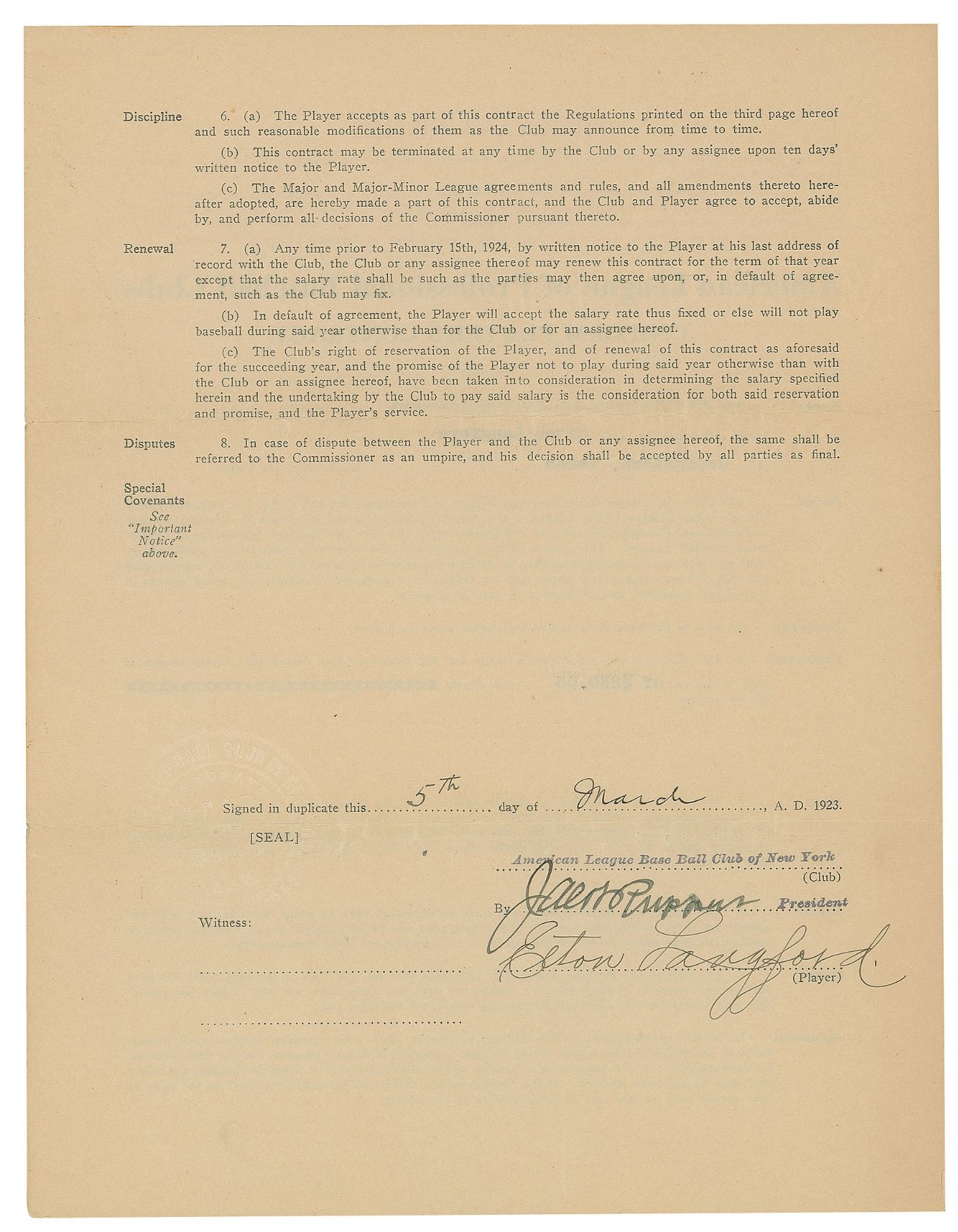 Desirable contract, four pages on two adjoining sheets, 8.5 x 11, March 5, 1923. Contract between the American League Base Ball Club of New York and Elton Langford for the 1923 season, with Langford receiving a salary of $250 per month. Signed at the conclusion in fountain pen by Jacob Ruppert and Langford, and on the reverse docket panel by Ban Johnson, approving the agreement. In fine condition, with short splits along folds.