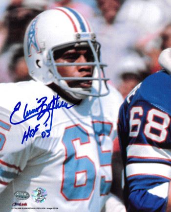Elvin Bethea played his entire career with the Houston Oilers. During his career in Houston, Bethea played in 210 games, including a stretch of 135 consecutive. He played at defensive end and guard in the 1968 season and didn’t miss a game until 1977. He led the team in sacks six times, finishing his career with 105 unofficial sacks. Bethea was elected to the Pro Football Hall of Fame in 2003. Elvin Bethea has hand signed this Houston Oilers 8x10 Photo with HOF 03 inscription. Certificate of Authenticity from Athlon Sports Collectibles.