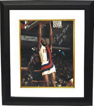 Elvin Hayes led the Washington Bullets to 3 NBA Finals (1975, 1978, and 1979), and an NBA title over The Seattle SuperSonics in 1978. He shined brightly, especially in the NBA playoffs. During the Bullets' championship season (1978), he averaged 21.8 points and 12.1 rebounds per game in 21 playoff games. Elvin Hayes has hand autographed this Washington Bullets 16x20 Photo with HOF 90 inscription. Leaf Authentics Hologram and Certificate of Authenticity from Athlon Sports. Custom White Mat and Premium Black Color Framed as shown.