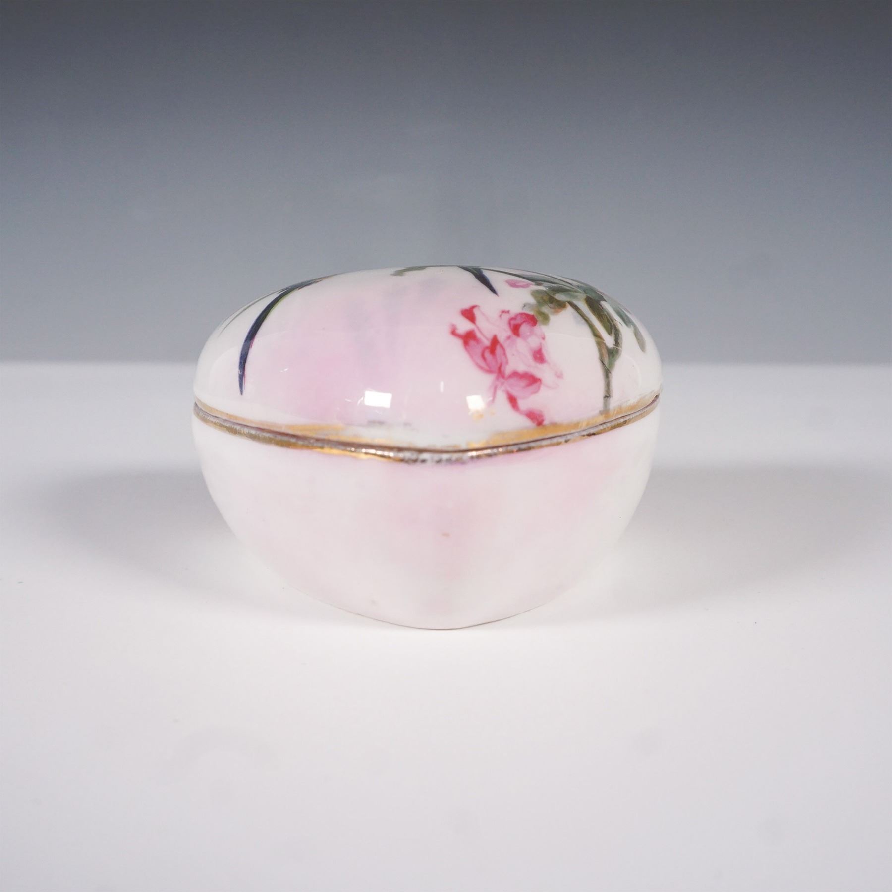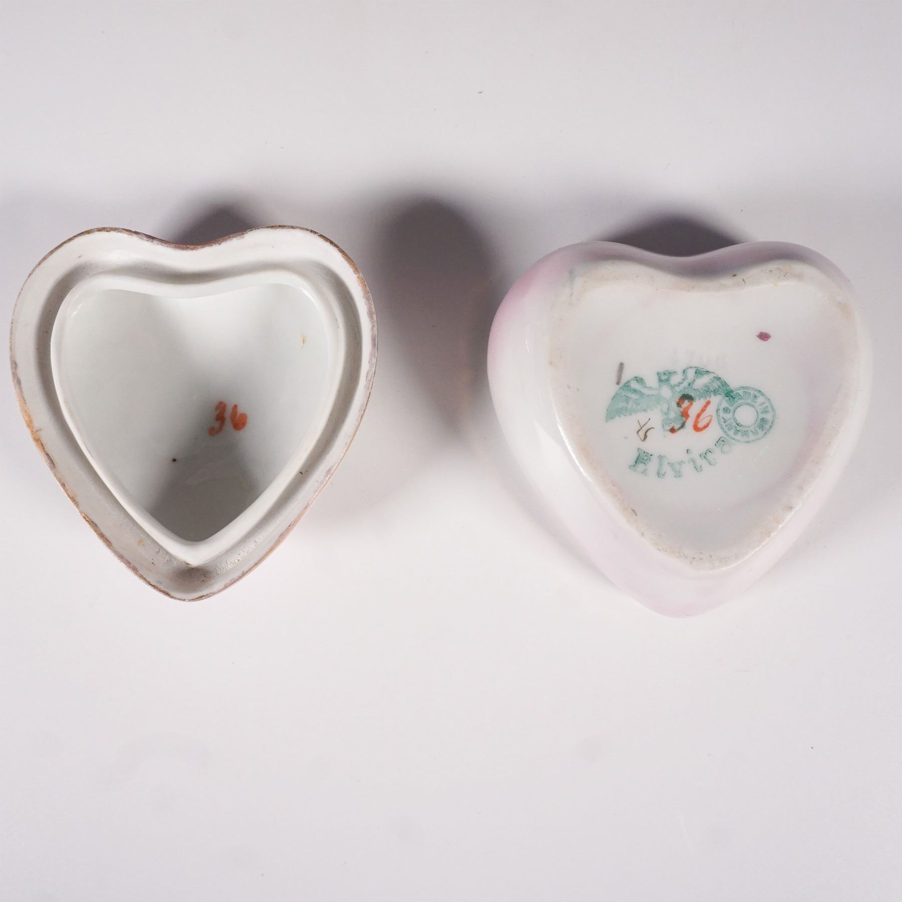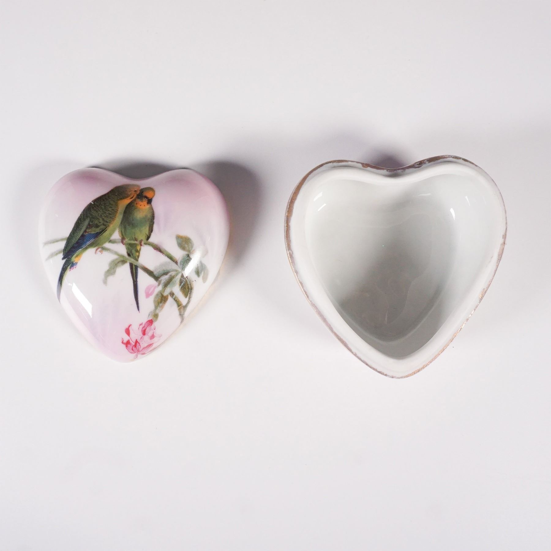 A delicate Elvira porcelain trinket box, crafted in Germany, featuring a heart-shaped form with a soft pink glaze. The lid is adorned with a finely detailed transfer print of two green parakeets perched on a flowering branch, adding to its charm. Accented with gold-tone trim along the edge, this piece embodies classic European porcelain craftsmanship. The underside bears the Elvira backstamp and Made in Germany marking, along with the number 36.