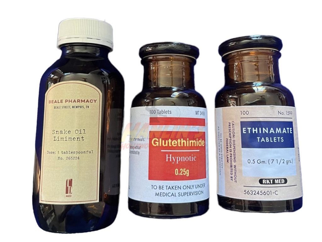 Original set of three pill bottles used in the production of the Baz Luhrmann directed biographical musical drama film 'Elvis' (2022), which follows the life of rock and roll icon, singer, and actor Elvis Presley, told from the perspective of his manager, Colonel Tom Parker.