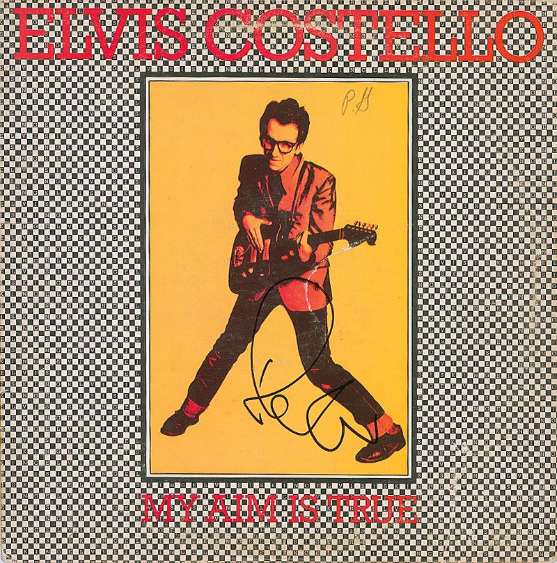 My Aim Is True album signed on the front cover in black felt tip. Edge wear, mild ‘ring of wear’ to cover, and a ballpoint notation to front cover, otherwise fine condition. The record is included. Accompanied by a photo taken at time of signing.