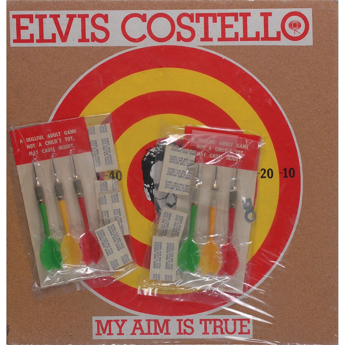 Rare promotional dart board for his debut album, My Aim Is True. Cork dart board measures 15.25 x 15.25, features an image of Costello in the center and was put out by Costello’s record label Stiff. Board is unused and comes with its six darts. In very fine condition.
