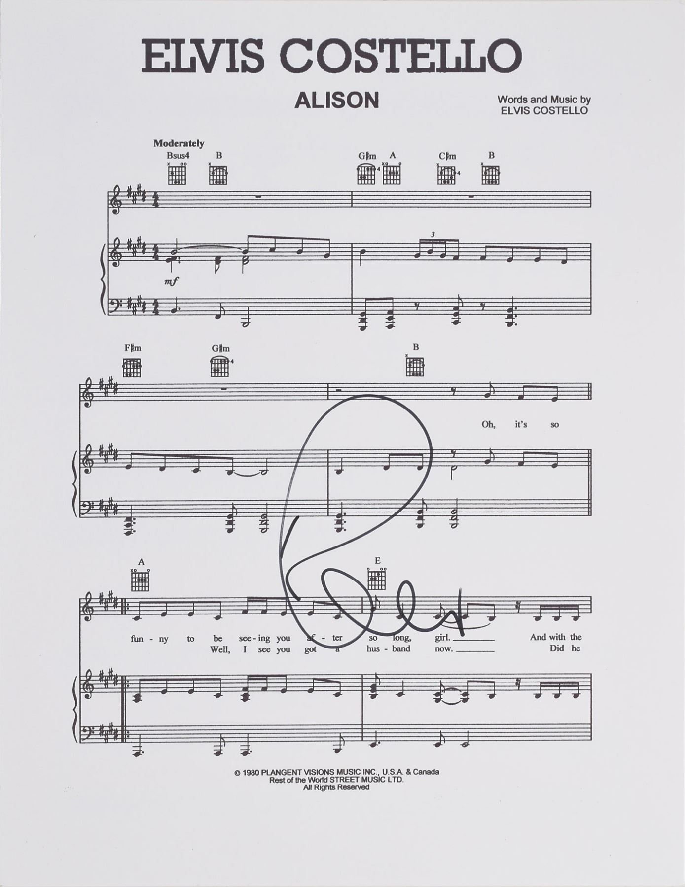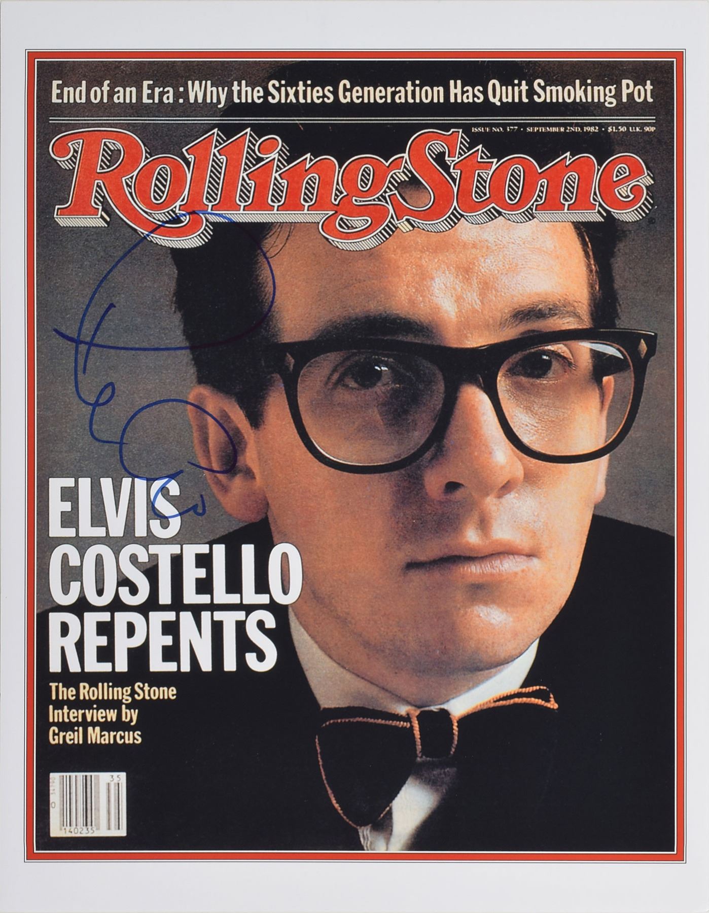 Two items: sheet music to the song ‘Alison,’ five pages, 8.5 x 11, signed on the first page in black felt tip; and a color satin-finish 11 x 14 photo of Costello on the front cover of Rolling Stone from September 2, 1982, signed in blue felt tip. In overall fine condition.