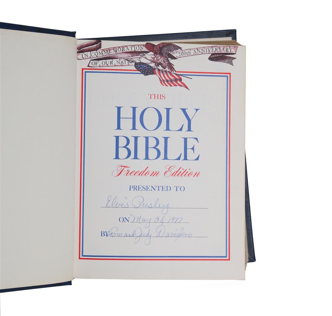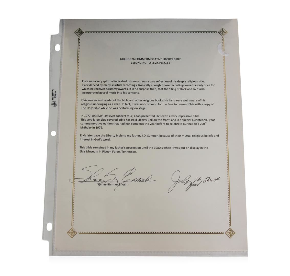 This is very special bible and has full documentation to prove its provenance. This bible comes with a letter of authenticity from the founder of the Elvis-a Rama Museum, Chris Davidson, as well as a letter from Shirley Sumner Enoch (daughter of J.D. Sumner). This incredible and special piece of Elvis memorabilia was given to Elvis Presley on May 8, 1977. This Bible was on display in the Elvis Museum in Pigeon Forge, Tennessee for many years. This is a chance to own a very special piece of Elvis Memorabilia that includes provenance!