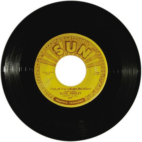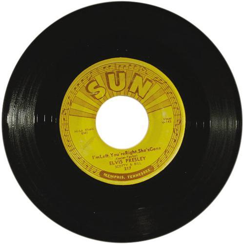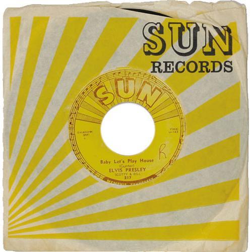 <B>Elvis Presley "Baby Let's Play House"/ "I'm Left, You're Right, She's Gone" 45 (Sun 217, 1955).</B></I> Elvis' fourth Sun release. The accompanying sleeve has been autographed by Scotty Moore and DJ Fontana. Condition: VG-EX 6. <I>From the Rockin' Rev Collection</B></I>.<BR><BR><b>Shipping:</b> Recordings (<a target="_blank" href="http://www.heritageauctions.com/common/shipping.php">view shipping information</a>)