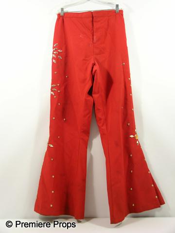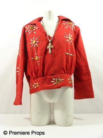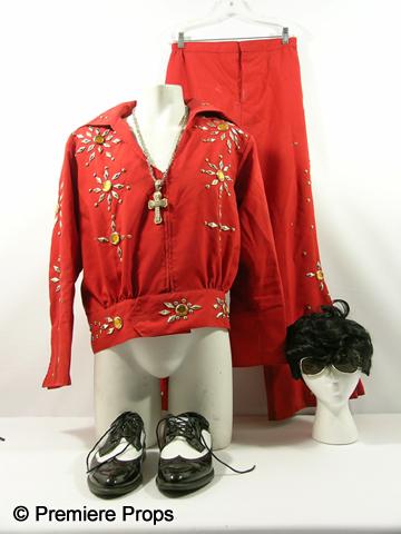 Elvis' red v-neck long sleeve with plastic jewels, zipper front with velcro 'Tabi's Characters' jacket, (size M) fake gold and plastic cross necklace, red with plastic jewels bell bottom pants, black wig, plastic gold with dark lenses glasses, and black and white plastic shoes.