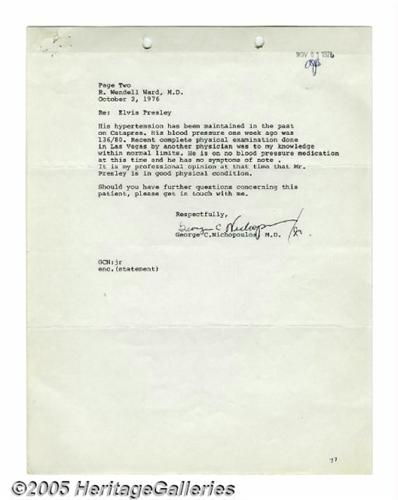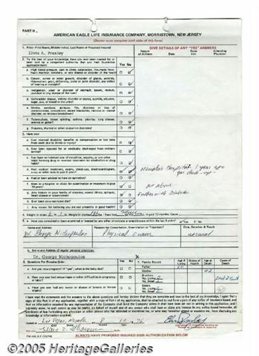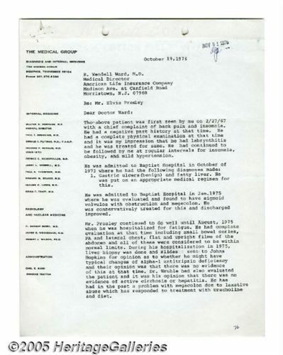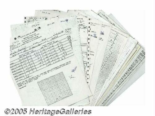 <B>Elvis Medical File.</B></I> The cause of Elvis Presley's August 1977 death remains a subject of widespread speculation, although it is commonly believed that drugs played a part. Featured in this lot are Presley's 36-page medical records spanning August 1975 to August 1976, all of which state that he was in perfect health at the time. Included are the results of his 1975 and '76 physicals; an EKG dated October 15, 1973; blood test results from August 1975 (for patient "Aaron Sivle"); and a January 1975 spastic colon diagnosis. The documents are in fair condition, with some discoloration, the expected amount of wear and tear, and the usual binder holes. <I>With COA from PSA/DNA.</B></I>