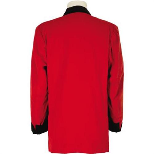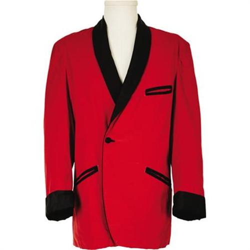 <B>Elvis Owned and Worn Red Velvet Jacket.</B></I> Elvis wore it in the '60s, but in 1968 Vernon and Dee Presley gave this gorgeous red velvet jacket to their friends C.W. Bradley and his wife Roberta. Bradley, the officiating minister at Elvis' funeral service, kept the jacket in his family for close to 40 years, and now in this special anniversary year of the King's death, the family has decided to share the jacket with a collector. Fully lined in black satin, the jacket is lush red velvet with black shawl collar, cuffs and accents. Accompanying the lot is an affidavit from Dee Presley, dated 2006, indicating that she saw Elvis wear the jacket and that she and Vernon gave the jacket to the Bradley family in 1968. Also included is a copied photograph of Dee Presley, with C.W. Bradley, holding the jacket at a 2005 reunion. Retaining its original tight seams, the jacket is in Very Fine condition considering its age, with only minor fading, a few small stains, and a few pulls on cuff material.<BR><BR><b>Shipping:</b> Clothing, Costumes & Jerseys (<a target="_blank" href="http://www.heritageauctions.com/common/shipping.php">view shipping information</a>)