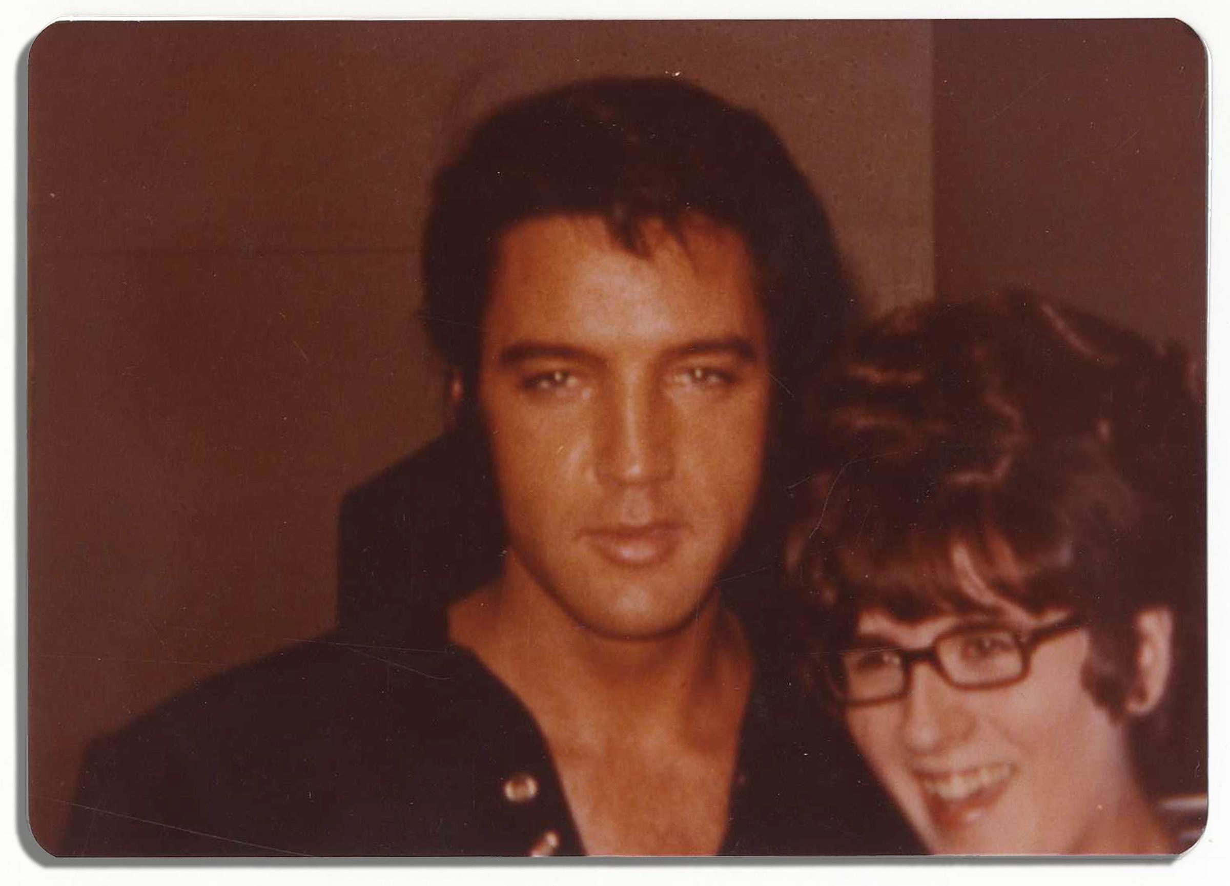 Excellent 5'' x 3.5'' satin color photo of the King of Rock n' Roll. Photo depicts Elvis posing with a fan. Near fine.