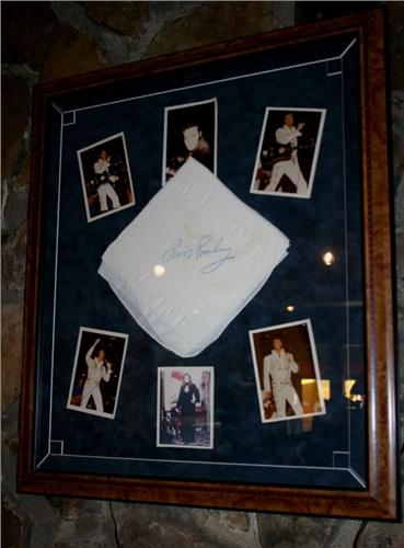 Five photographs of Elvis Presley in concert surround a handkerchief with the name Elvis Presley written on it. These are reported to photographs taken by the individual in the bottom center photo when she attended a concert. Look closely at the stains on the handkerchief. These are said to be perspiration stains of the King himself.