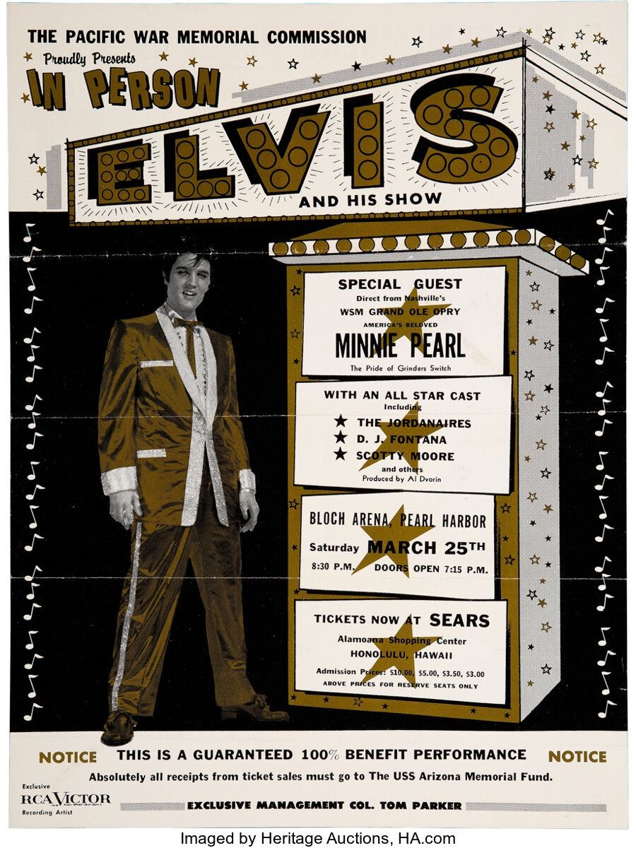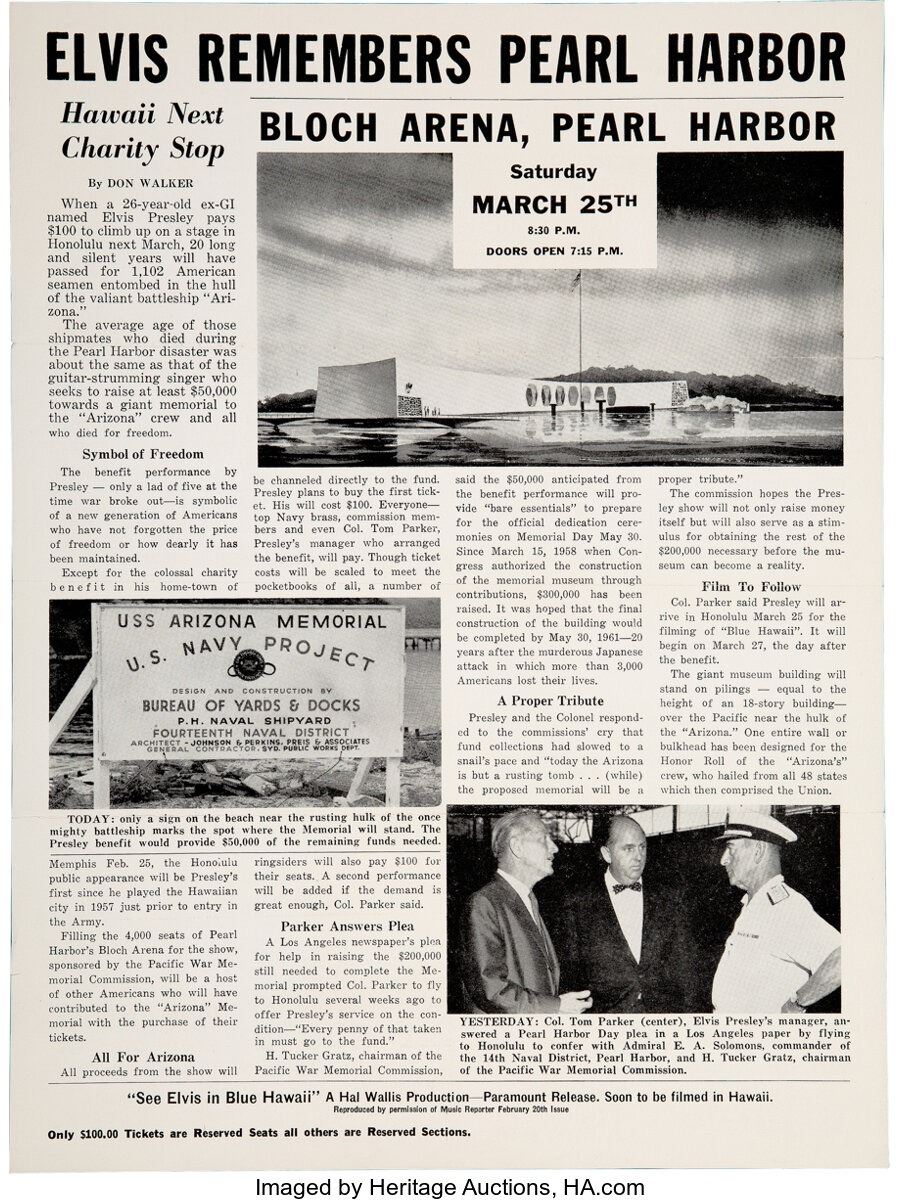 Elvis Presley 1961 Bloch Arena, Pearl Harbor HI Concert Handbill. A 9 ¼" x 12 ¼" handbill for a charity performance headlined by the King of Rock ‘N' Roll (with the Jordanaires, DJ Fontana, and Scotty Moore) with a special guest appearance by Minnie Pearl. As a "guaranteed 100 % benefit performance" per the handbill, all of the ticket sales went to the USS Arizona Memorial Fund. This was a time when Elvis did not perform many concerts, as he was filming a lot of movies at the time (Blue Hawaiiin particular at the time). Has an article by Don Walker about Elvis's thoughts on Pearl Harbor on verso. In Very Good condition with fold marks throughout. Comes with catalog cut-out from previous auction house that sold the lot. COA from Heritage Auctions.
