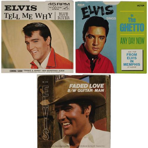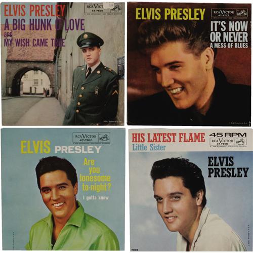 <B>Elvis Presley 45 Picture Sleeve Group of 14 (RCA, 1959-81).</B></I> This fine grouping of The King features 13 picture sleeves without the associated record, and one that includes the record: "A Big Hunk O' Love" (RCA 7600, 1959) in EX 7(sleeve)/ VG-EX 6(record); two copies of "It's Now Or Never" (RCA 7777, 1960) both in NM 8; two copies of "Are You Lonesome Tonight?" (RCA 7810, 1960) in MT 9 and NM 8; "Little Sister"/ "His Latest Flame" (RCA 7908, 1961) in NM 8; "Can't Help Falling In Love" (RCA 7968, 1961) in NM 8; "Good Luck Charm" (RCA 7992, 1962) in NM 8; "Return To Sender" (RCA 8100, 1962) in NM 8; two copies of "Devil In Disguise" (RCA 8188, 1963), both in NM 8; "Tell Me Why" (RCA 8740, 1965) in NM 8; "In The Ghetto" (RCA 9741, 1969) in EX 7; and "Guitar Man" (RCA 12158, 1981) in NM 8. <I>From the GRT Collection</B></I>.<BR><BR><b>Shipping:</b> Recordings (<a target="_blank" href="http://www.heritageauctions.com/common/shipping.php">view shipping information</a>)