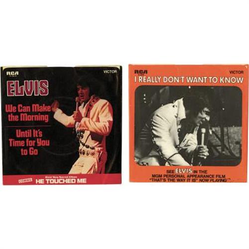 <B>Elvis Presley 45 w/Picture Sleeve Group of 10 (RCA, 1961-73).</B></I> Nice blend of '60s and '70s recordings with picture sleeves from the Diskin Sisters collection. We've noted those with written date notations, typically when Colonel Tom Parker gave the copy to the sisters, with "woc" for "writing on cover". Every record is at least NM 8, with some grading MT 9. Included are: "Surrender"/ "Lonely Man" (7850, 1961) in NM 8/ NM 8; "Good Luck Charm"/ "Anything That's Part of You" (7992, 1962) in NM 8/ MT 9; "She's Not You"/ "Just Tell Her Jim Said Hello" (8041, 1962) in NM 8/ MT 9; "In The Ghetto"/ "Any Day Now" (9741, 1969) in VG-EX 6 (woc)/ NM 8; "Suspicious Minds"/ "You'll Think of Me" (9764, 1969) in EX 7 (woc)/ NM 8; "Kentucky Rain"/ "My Little Friend" (9791, 1970) in EX 7 (woc)/ NM 8; "I Really Don't Want to Know"/ "There Goes My Everything" (9960, 1970) in EX 7 (woc)/ NM 8; "Where Did They Go Lord"/ "Rags to Riches" (9980, 1971) in EX 7/ NM 8; "Until It's Time For You To Go"/ "We Can Make the Morning" (0619, 1972) NM 8/ NM 8; and "Steamroller Blues"/ "Fool" (0910, 1973) in EX 7/NM 8. <I> From the Madison Collection.</B></I><BR><BR><b>Shipping:</b> Recordings (<a target="_blank" href="http://www.heritageauctions.com/common/shipping.php">view shipping information</a>)