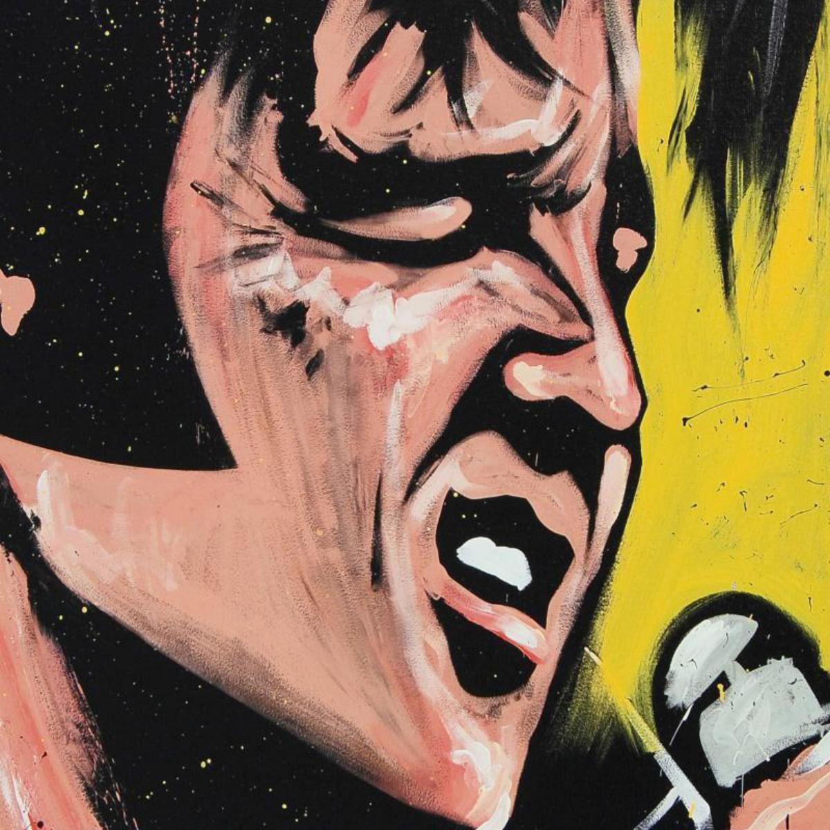 Combining his passions for music and art, David Garibaldi creates stunning visual poetry. "Elvis Presley (68 Special))" is a limited edition giclee on stretched canvas, numbered and bearing the artist's authorized signature. This piece comes gallery wrapped. Includes Letter of Authenticity. Measures approx. 18" x 24" (image). Reference #: 237405.
