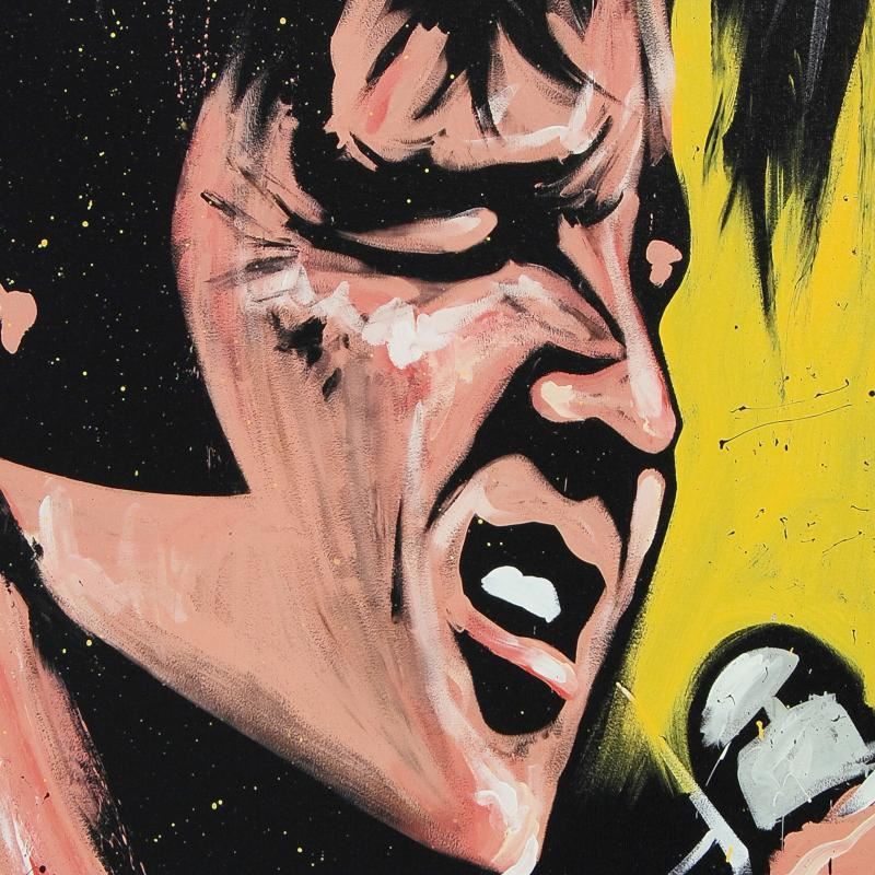 Combining his passions for music and art, David Garibaldi creates stunning visual poetry. "Elvis Presley (68 Special))" is a limited edition giclee on stretched canvas, numbered and bearing the artist's authorized signature. This piece comes gallery wrapped. Includes Certificate of Authenticity! Measures approx. 18" x 24" (image).