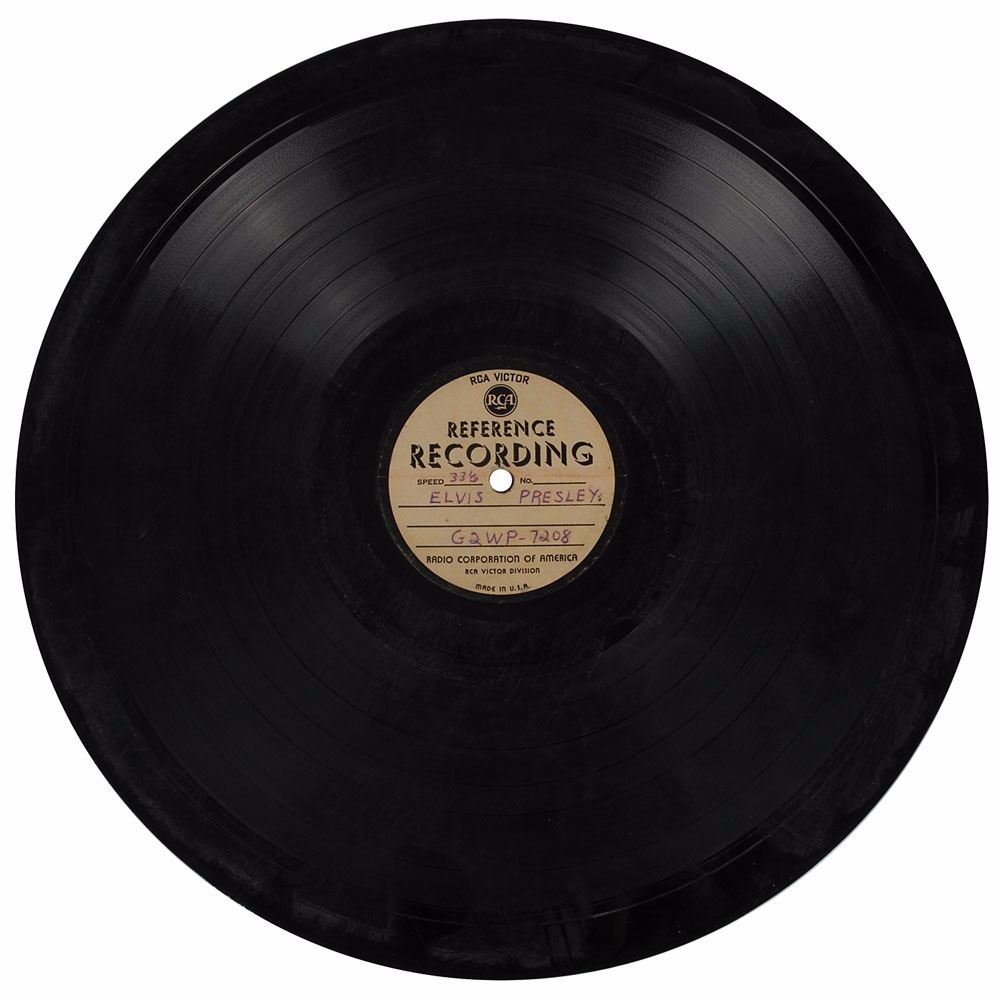 Rare RCA Victor 'Reference Recording' acetate of the 1956 album Elvis, with labels on both sides bearing ink notations, "33 1/3, Elvis Presley," with side one bearing number "G2WP-7207," and the other, "G2WP-7208." In fine condition. This acetate includes an alternate version of the record's eighth track 'Old Shep.' Released on October 19, 1956, Elvis debuted on Billboard's Top 200 in late 1956 before rising to No. 1 and holding the top spot for five weeks.