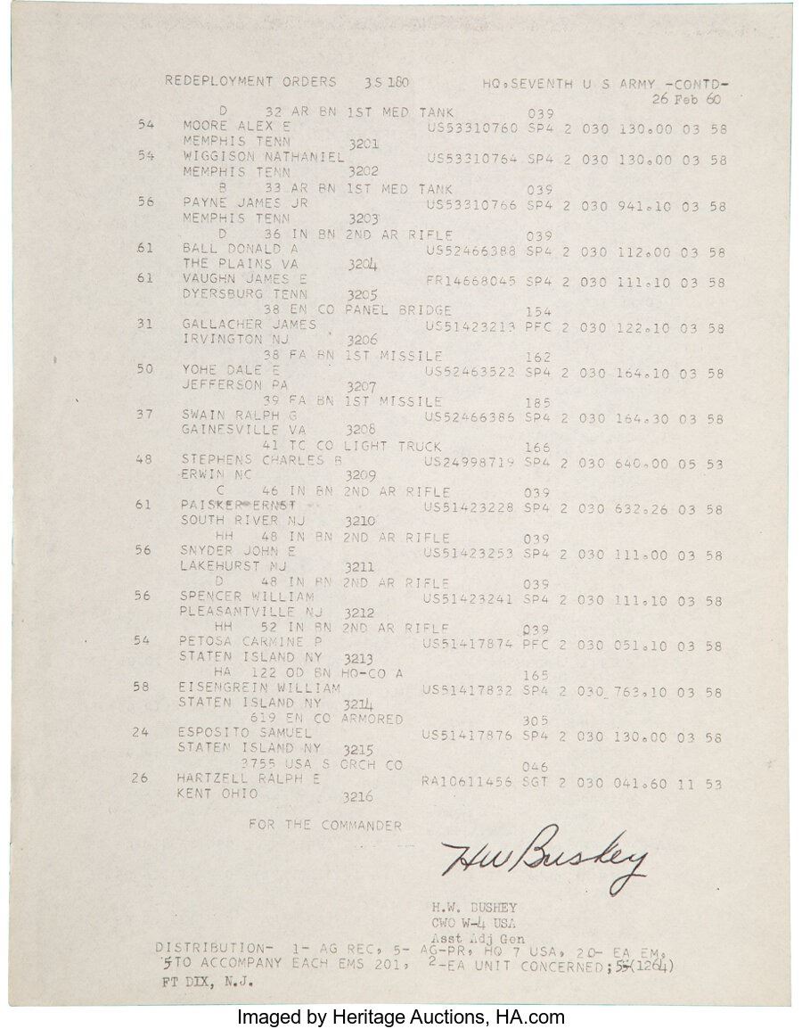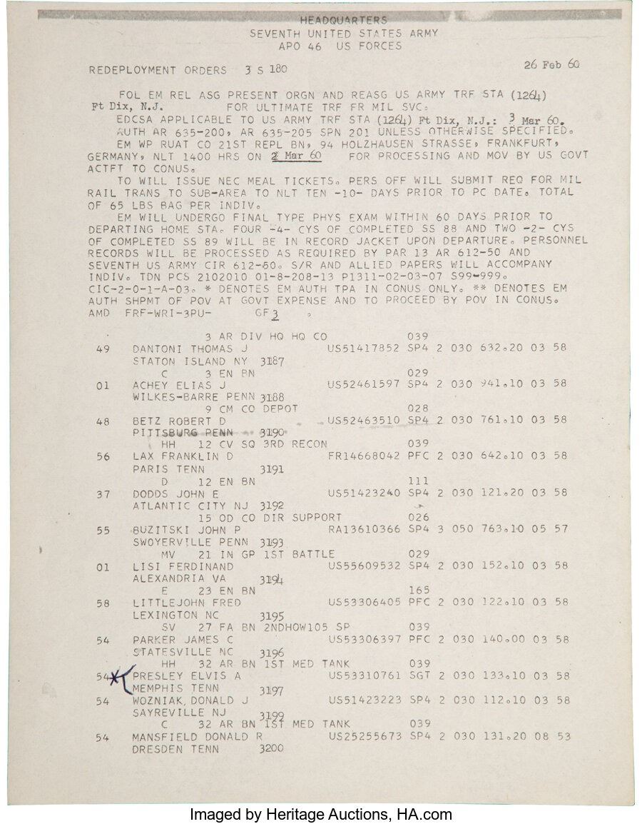 Elvis Presley Army Redeployment/Discharge Document(1960). Signed by Elvis' commanding officer H.W. Bushey in February 1960, this is a double-sided, typed document. It was pending on a physical where he could return home to resume his musical career. Measures 8 ½" x 10 ¾". Has black ink star and bracket next to Elvis' name. In Very Good Plus condition with light toning and some ink bleed. Comes with a print out of Elvis with his unit for display purposes. COA from Heritage Auctions.