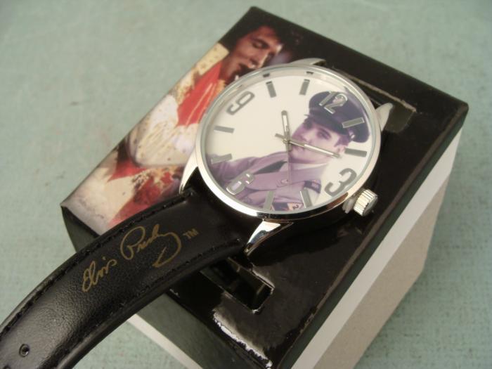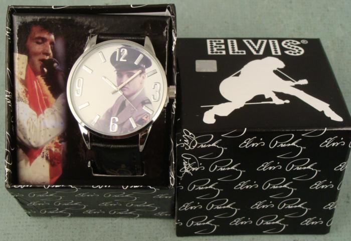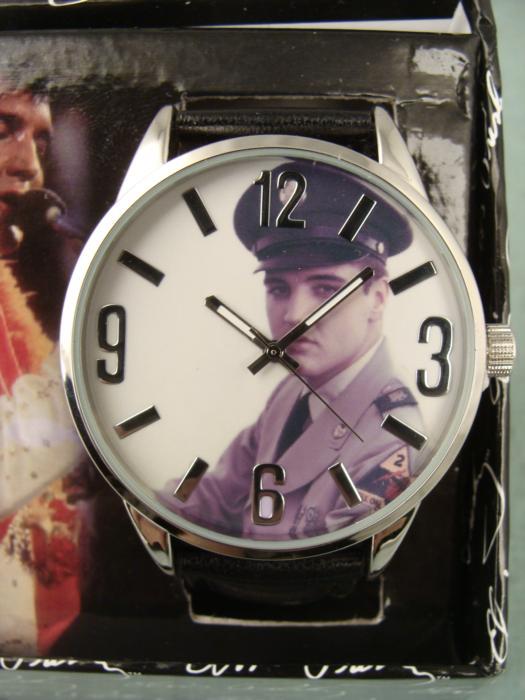 Pay tribute to Elvis Presley's military service with this terrific watch. The face has a great photo image of the King in uniform. It has chrome tone hands, and chrome tone body. It comes in a collectible box with Signature Product hologram sticker from Elvis.com.