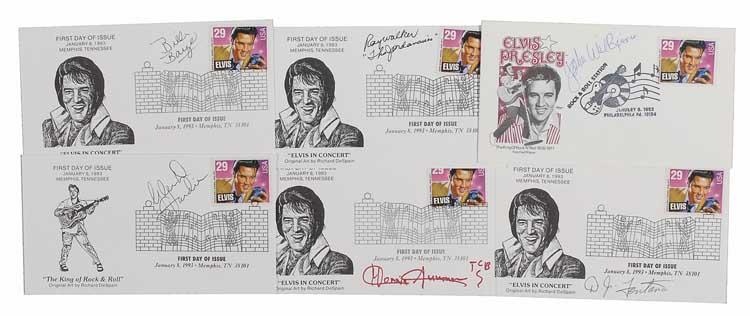 Six FDCs, each bearing a cachet honoring Elvis, and each signed in ink by a different former member of Presley’s band: D. J. Fontana, Ray Walker, Donnie Sumner, Glen Hardin, and Tom Dumont. In very fine condition. RRAuction COA.