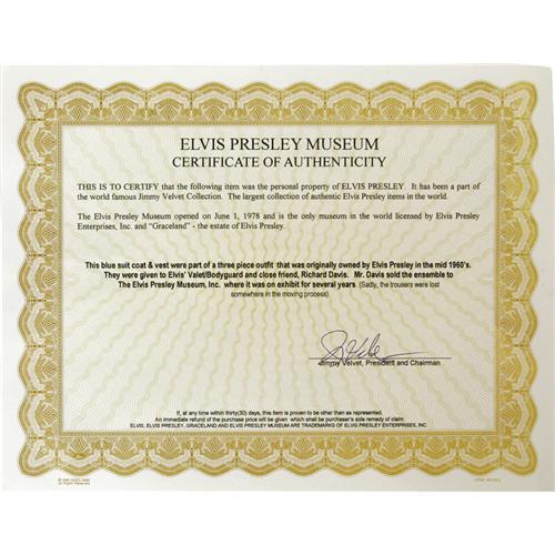 <B>Elvis Presley Blue Suit Coat with Matching Vest.</B></I> A blue suit coat and vest from a three-piece outfit owned and worn by Elvis in the mid '60s. The ensemble was later given to his valet/bodyguard and close friend Richard Davis, who eventually sold it to Jimmy Velvet who displayed it in the Elvis Presley Museum. Sadly, the trousers have gone missing, but the coat and vest are in Excellent condition. <I>Accompanied by a COA from the Elvis Presley Museum.</B></I><I>From the Robert Johnson Memorabilia Collection.</B></I><BR><BR><b>Shipping:</b> Clothing, Costumes & Jerseys (<a target="_blank" href="http://www.heritageauctions.com/common/shipping.php">view shipping information</a>)