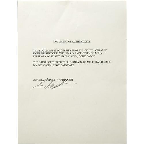 <B>Elvis Presley Ceramic Bust.</B></I> An 11" white ceramic bust of Presley, given as a gift by a fan to Aurelia Dupont in 1979. In Excellent condition. <I>From the Aurelia Dupont Collection</B></I>.<BR><BR><b>Shipping:</b> Miscellaneous Collectibles, Smal (<a target="_blank" href="http://www.heritageauctions.com/common/shipping.php">view shipping information</a>) <BR><BR><B>Important notic