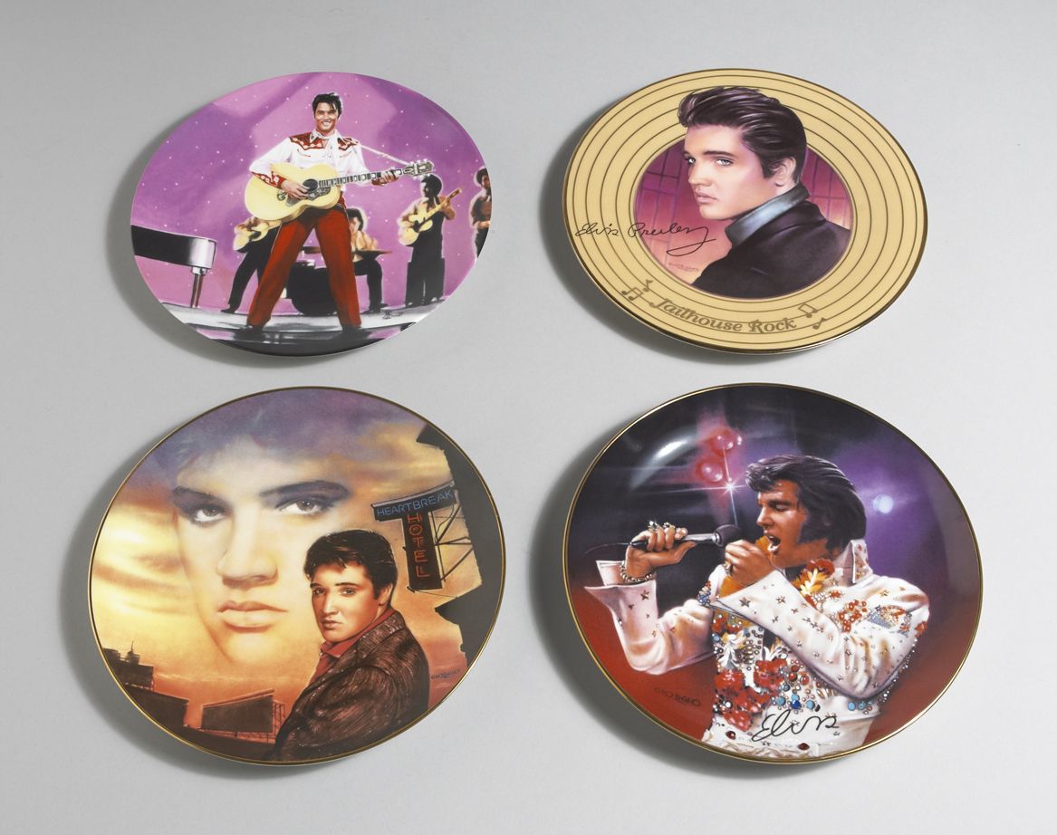 Collection of four numbered limited edition plates commemorating Elvis and titled Loving You", "Jailhouse Rock", "Heartbreak Hotel" and "The King". Artwork by Nate Giorgio and Bruce Emmett. Also with an Elvis mousemat. (5 items)"