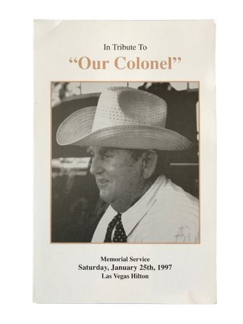 Colonel Tom Parker's memorial service program. Colonel was Elivs Presley's manager. He was know for shrew business acumen and his ability to promote Elvis as a globabl phenomenon. He managed his career from 1955 until Eliv's death in 1977. The memorial program cover page reads: In tribute to: “Our Colonel” memorial service Saturday, January 25, 1997, Las Vegas Hilton. Inside page has several photos of him in his life on the left. On the right it says in memory of Thomas A. Parker, born June 26, 1909, departed January 21, 1997. He was a man who lived a technicolor life in our black-and-white world and shared that color with those he touched. Thank you, Colonel.