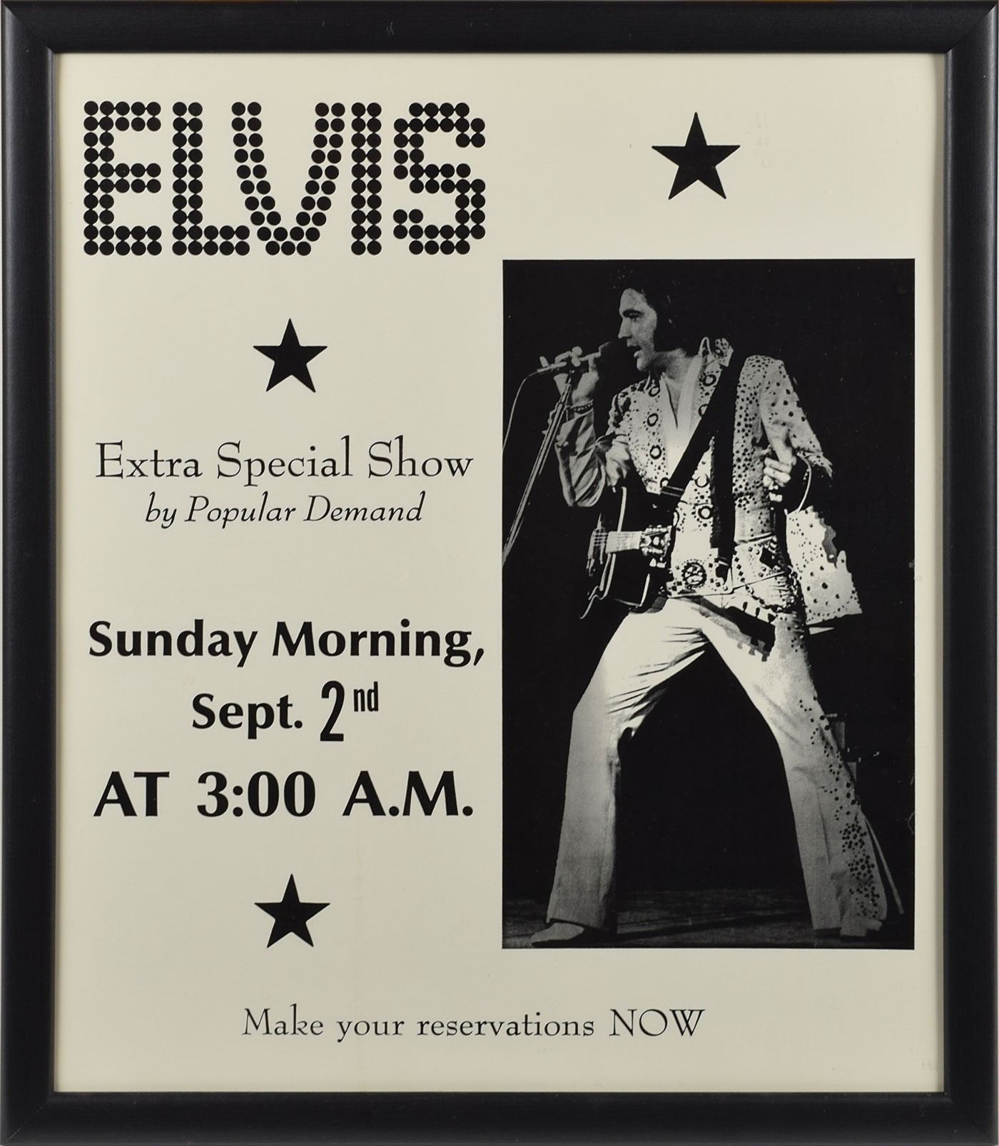 Original vintage 16 x 18.75 poster promoting an Elvis Presley concert at 3:00 AM on September 2, [1973], which shows Presley in an excellent full-length pose next to a large ‘Elvis in lights’ logo. The poster, which notes the concert as an “Extra Special Show by Popular Demand,” took place at the Las Vegas Hilton on a packed Labor Day weekend. Framed to a slightly larger size. In fine condition.